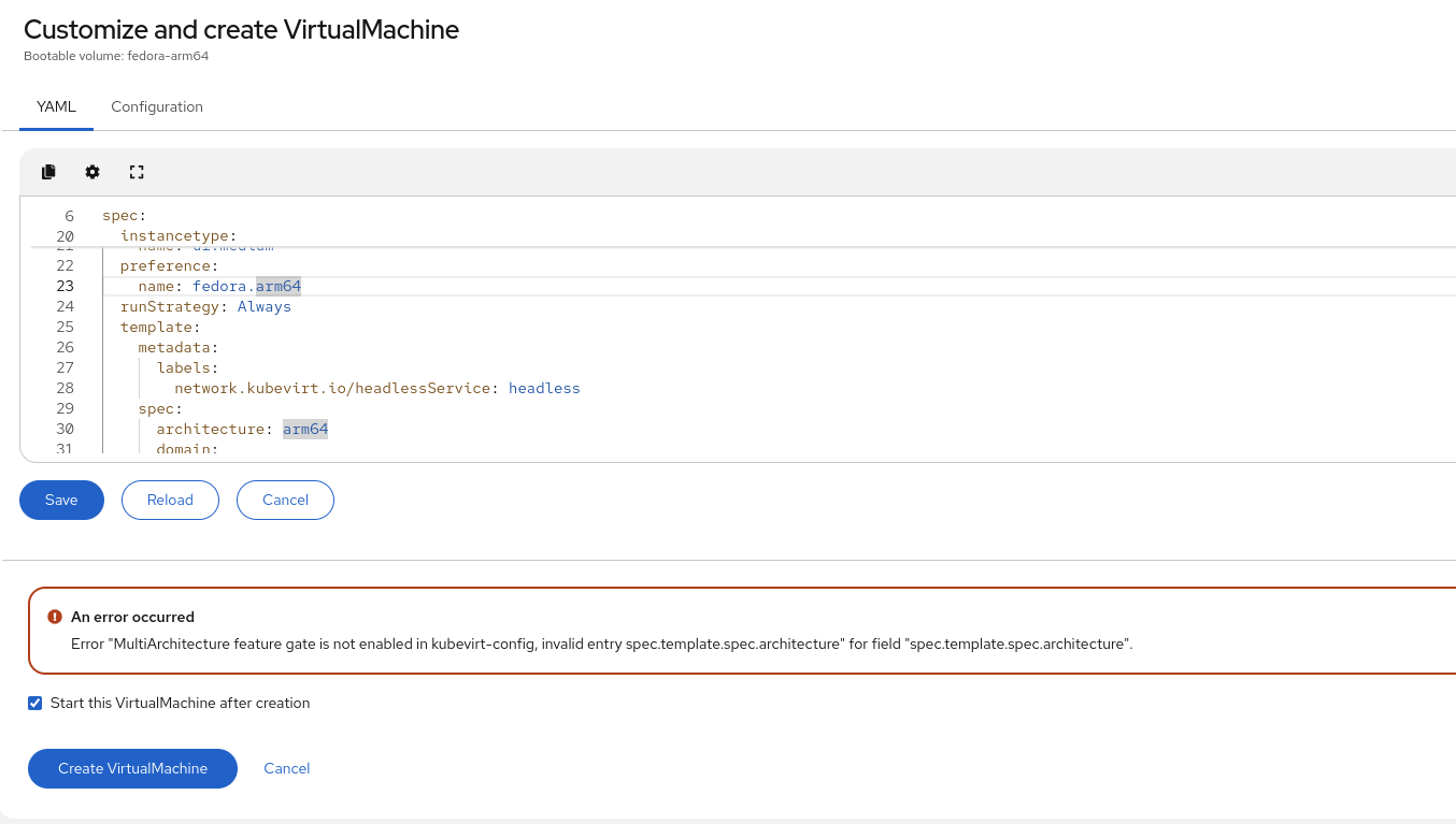 While creating a VM from fedora arm64 datasource, 1. Datasource points to fedora preference and not fedora arm preference. works fine for rhel10 and rhel9 $ oc get datasources fedora-arm64 -n openshift-virtualization-os-images -o yaml apiVersion: cdi.kubevirt.io/v1beta1 kind: DataSource labels: app.kubernetes.io/component: storage app.kubernetes.io/managed-by: cdi-controller app.kubernetes.io/part-of: hyperconverged-cluster app.kubernetes.io/version: 4.20.0 cdi.kubevirt.io/dataImportCron: fedora-image-cron-arm64 instancetype.kubevirt.io/default-instancetype: u1.medium instancetype.kubevirt.io/default-preference: fedora kubevirt.io/dynamic-credentials-support: "true" template.kubevirt.io/architecture: arm64 $ oc get datasources rhel10-arm64 -n openshift-virtualization-os-images -o yaml apiVersion: cdi.kubevirt.io/v1beta1 kind: DataSource app.kubernetes.io/component: storage app.kubernetes.io/managed-by: cdi-controller app.kubernetes.io/part-of: hyperconverged-cluster app.kubernetes.io/version: 4.20.0 cdi.kubevirt.io/dataImportCron: rhel10-image-cron-arm64 instancetype.kubevirt.io/default-instancetype: u1.medium instancetype.kubevirt.io/default-preference: rhel.10.arm64 kubevirt.io/dynamic-credentials-support: "true" template.kubevirt.io/architecture: arm64 2. when i pick fedora.arm64 prefernce manually, VM gets configured on non arm cluster which doesn't look right. if i set arch explictly in VM config under spec.template.spec.archtecture: arm64, it throws Danger alert:An error occurredError "MultiArchitecture feature gate is not enabled in kubevirt-config, invalid entry spec.template.spec.architecture" for field "spec.template.spec.architecture". i don't see it in FG $ oc get kubevirt kubevirt-kubevirt-hyperconverged -n openshift-cnv -o json | jq .spec.configuration.developerConfiguration.featureGates [ "CPUManager", "Snapshot", "HotplugVolumes", "ExpandDisks", "HostDevices", "VMExport", "KubevirtSeccompProfile", "VMPersistentState", "InstancetypeReferencePolicy", "WithHostModelCPU", "HypervStrictCheck"] HCO have enableMultiArchBootImageImport: true set $ oc get hco kubevirt-hyperconverged -n openshift-cnv -o json | jq .spec.featureGates { "alignCPUs": false, "decentralizedLiveMigration": false, "deployKubeSecondaryDNS": false, "disableMDevConfiguration": false, "downwardMetrics": false, "enableMultiArchBootImageImport": true, "persistentReservation": false }