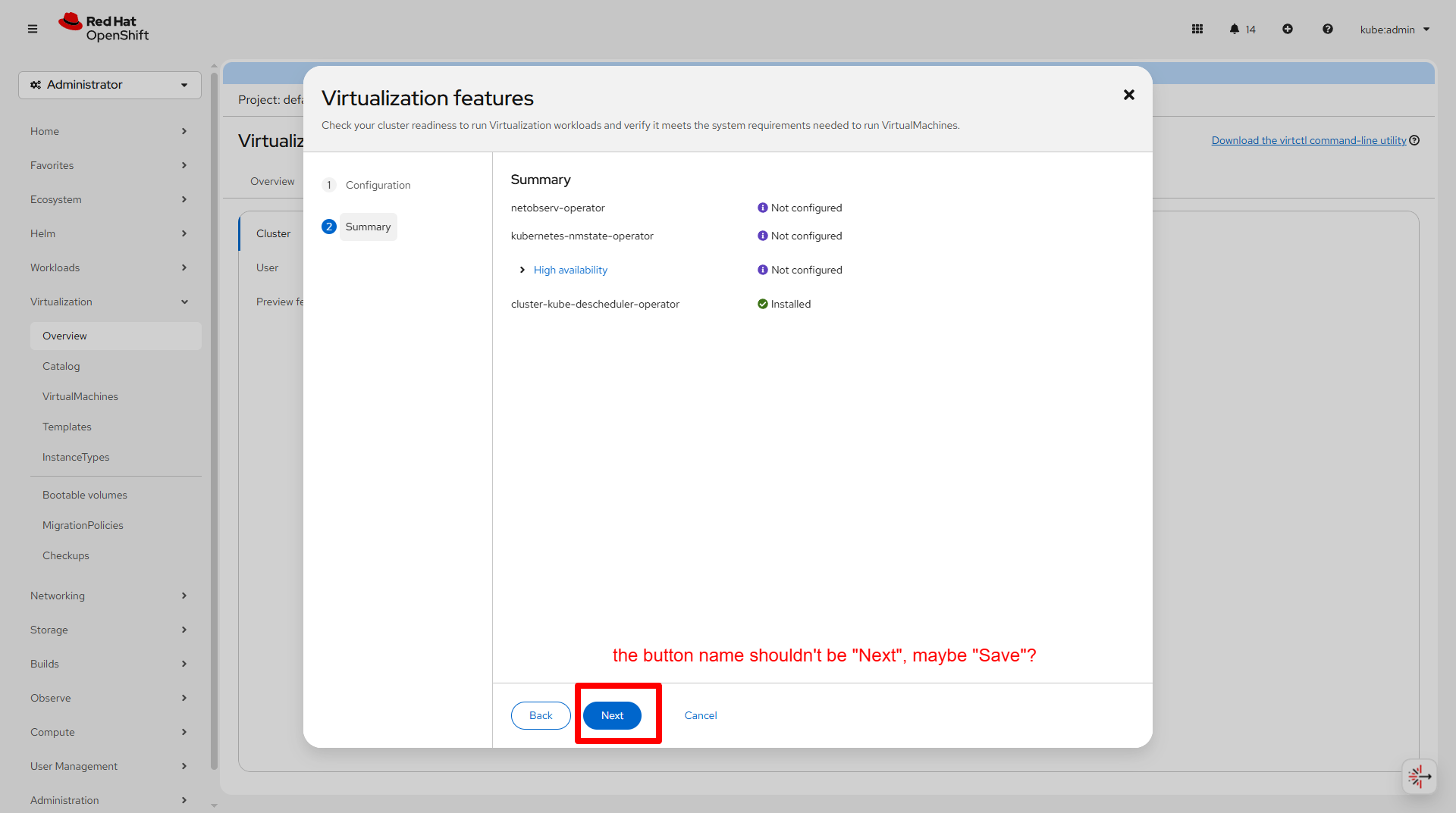 The button name "Next" presents on summary page in "Configure features"
