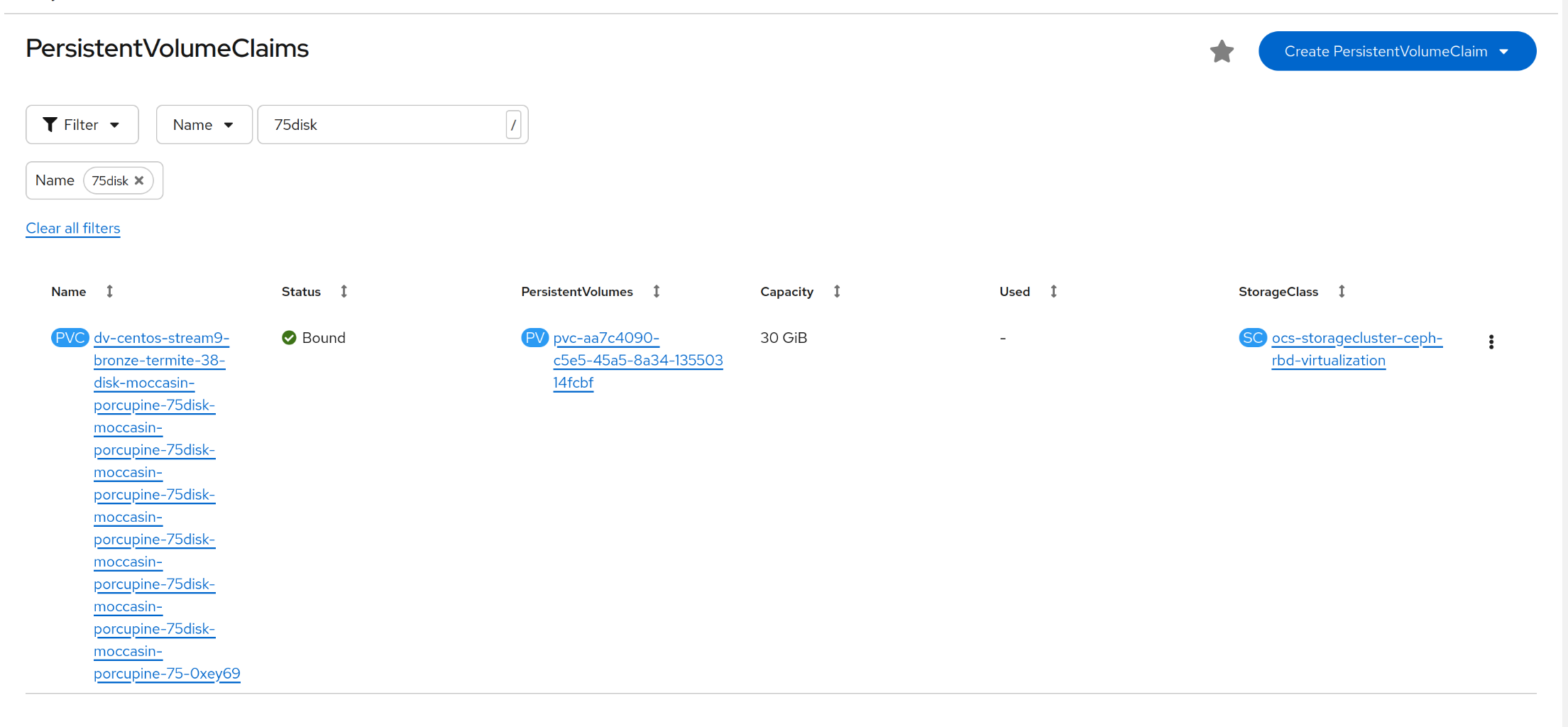 1. add a new disk using "Add Empty disk(blank)" modal 2. disk name is generated for the user (but editable) - make sure it's longer then 20chars 3. create the disk my clicking "save" 4. detach the disk (action in the kebab menu) 5. add volume again using virtctl i.e. := ยป virtctl addvolume centos-stream9-bronze-termite-38 --volume-name=dv-centos-stream9-bronze-termite-38-disk-black-scorpion-97-8xjlop -n radek --persist