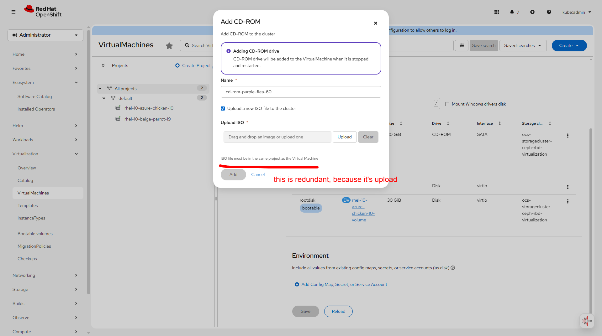 1. the description is different, see attachments 2. remove the sentence at the bottom, because the ISO file is uploading to the cluster, it's not depend on by user