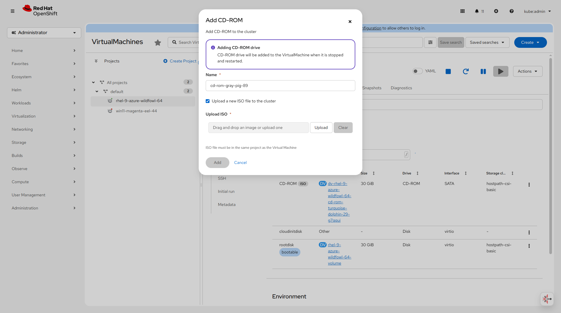 In CD-ROM modal,use an existing CD-ROM or upload new ISO file to VM is not quite clear, suggest to align it with secret modal, use "Add new" and "Use existing"