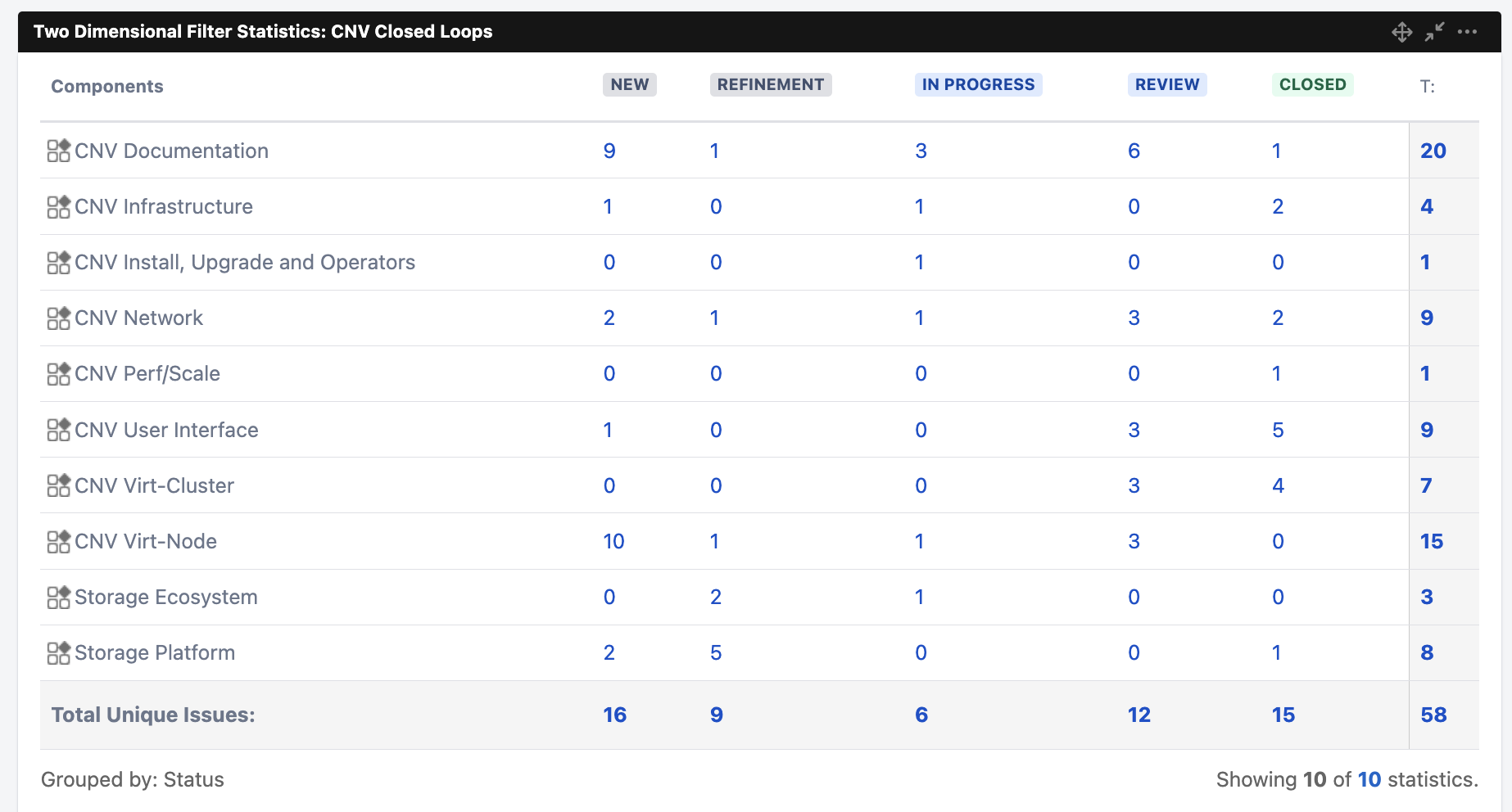 https://issues.redhat.com/secure/Dashboard.jspa?selectPageId=12383090# shows the number of Closed Loop issues filed for CNV components (currently 44).