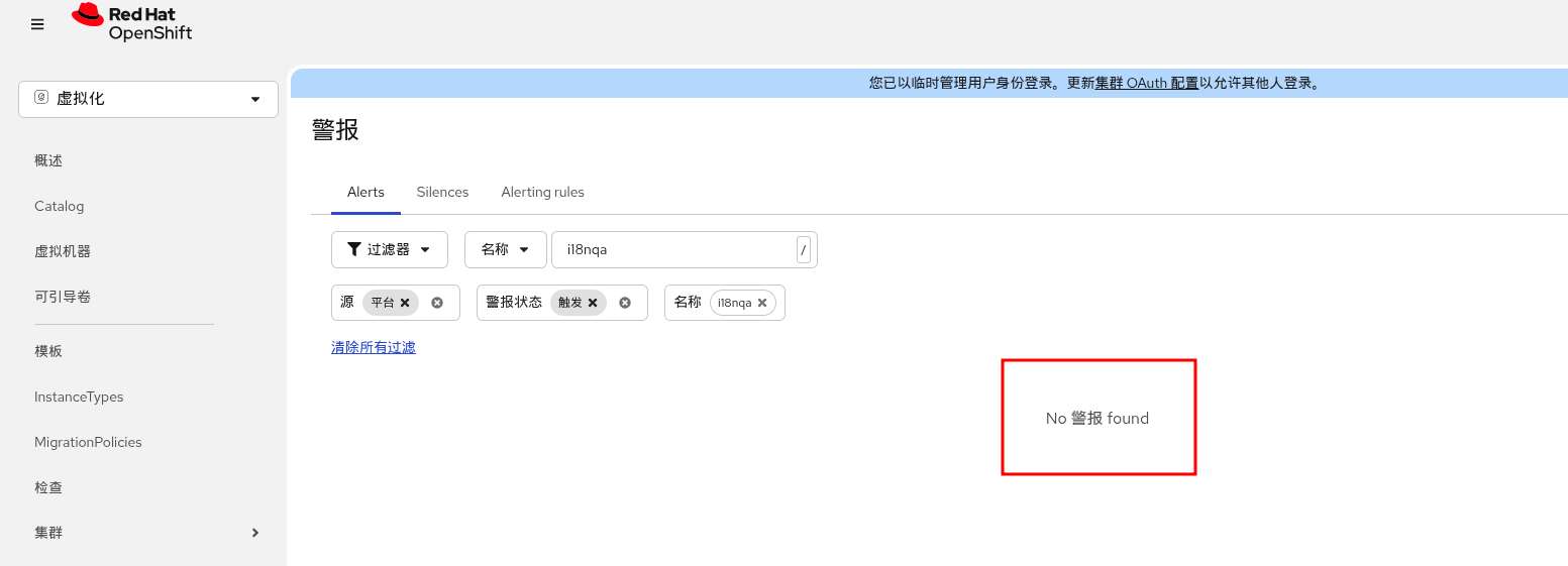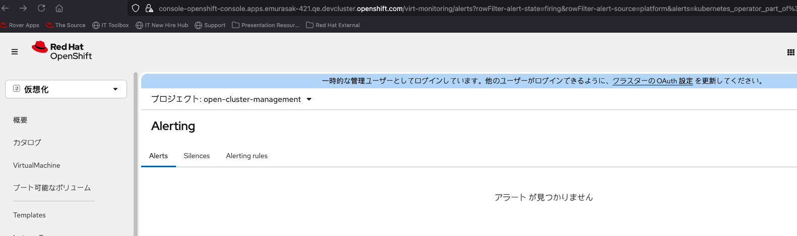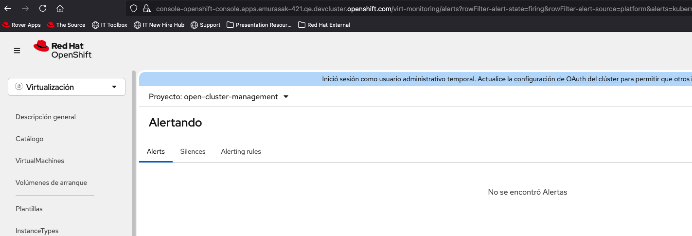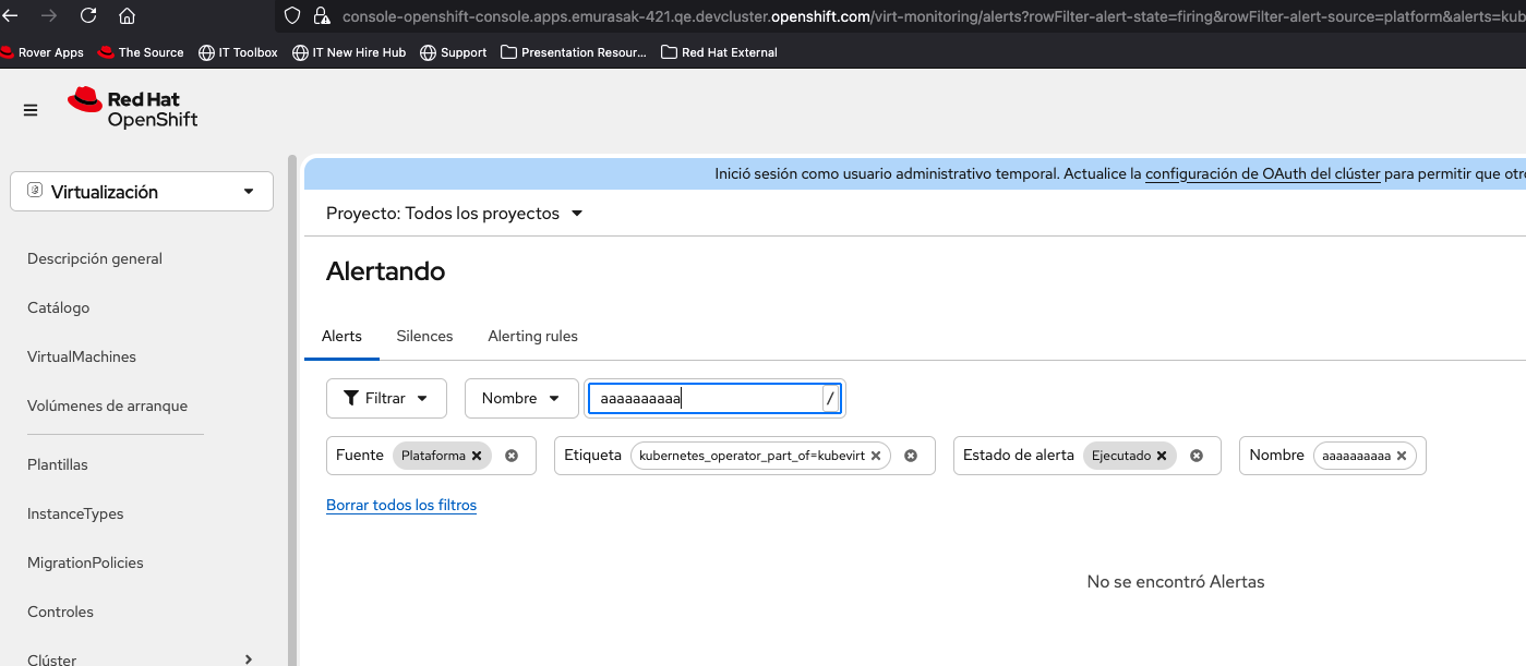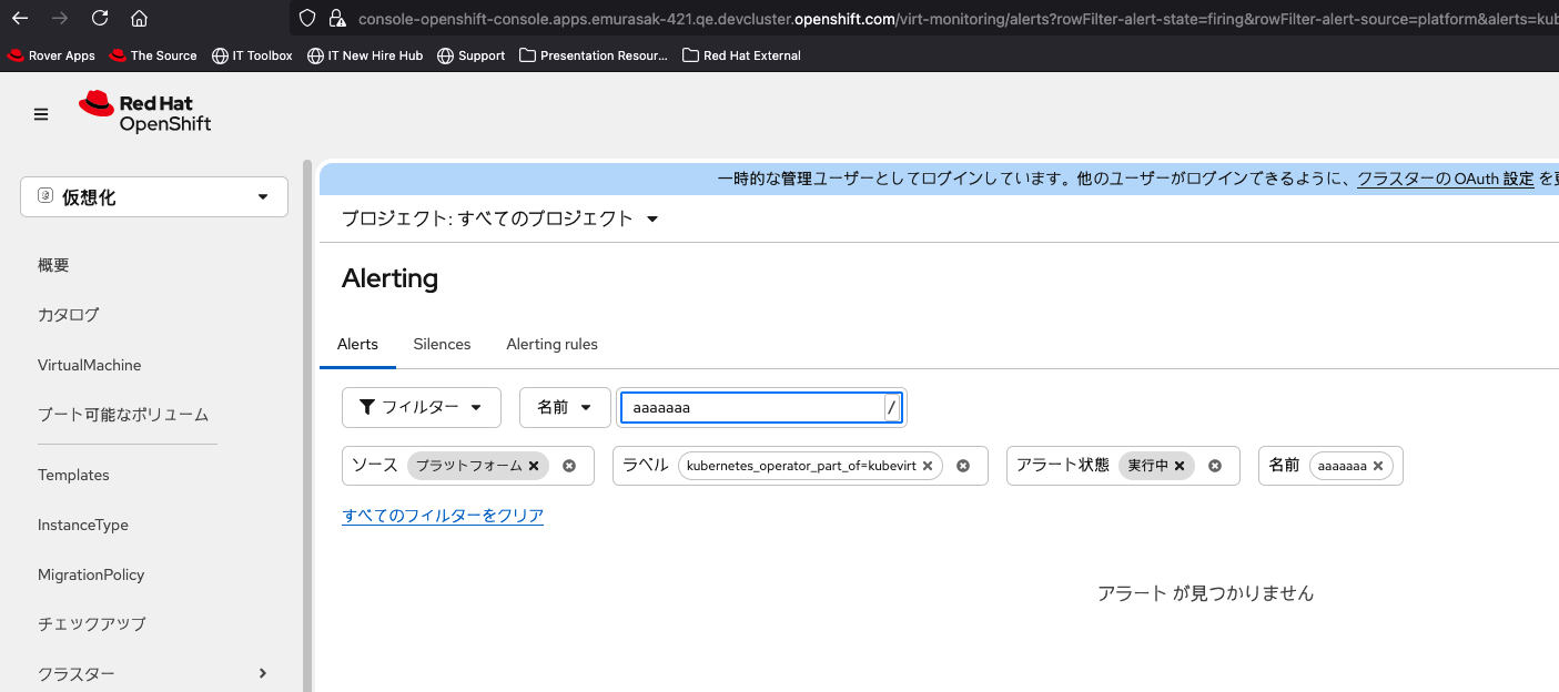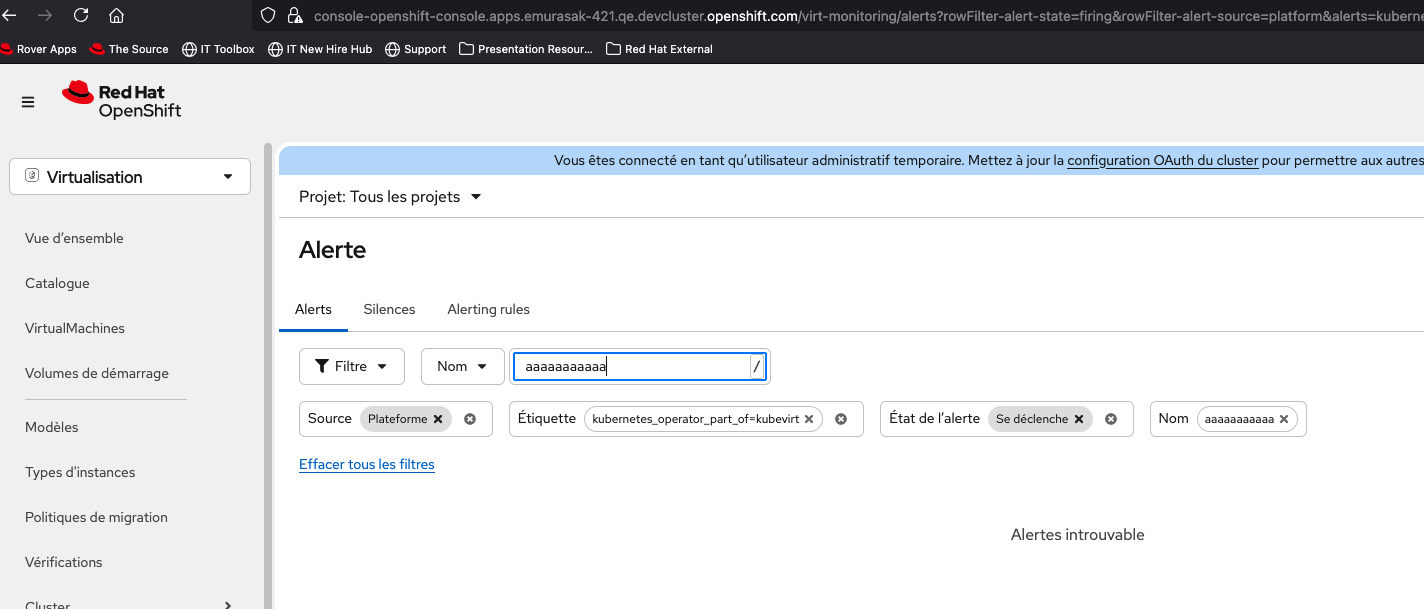1. Select Virtualization from the top left navigator of OCP Web Console. 2. Click Overview from the left navigation bar. 3. Click Overview tab and click 'View all' next to Alerts. 4. Input in 'Search by name' in Alerts tab.