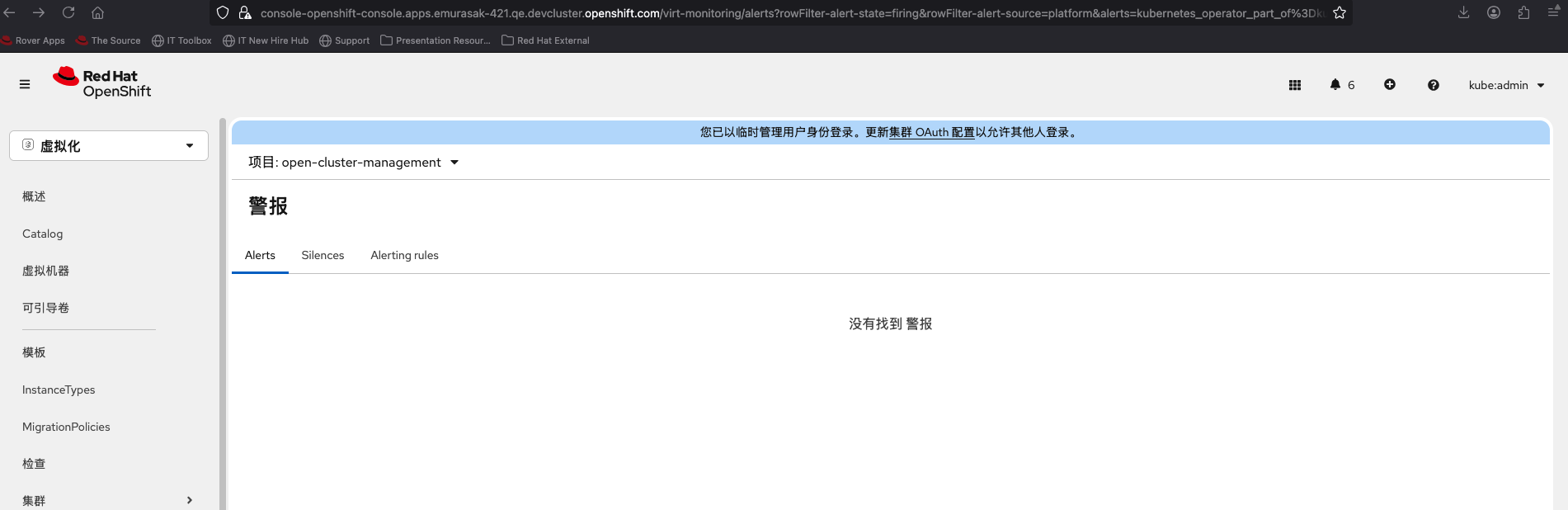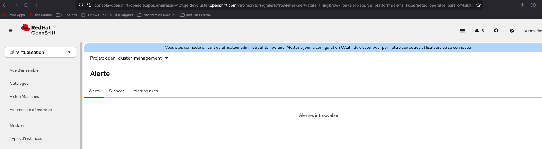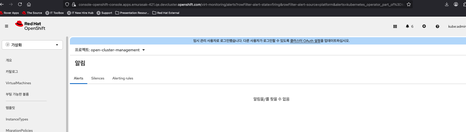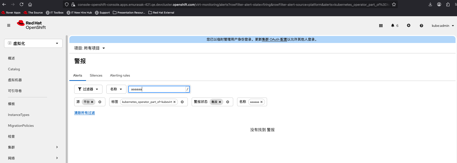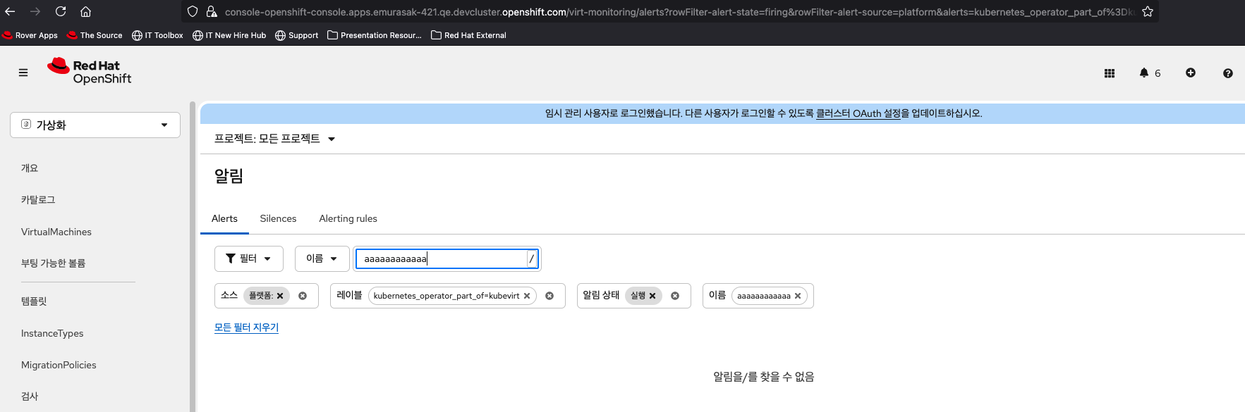 1. Select Virtualization from the top left navigator of OCP Web Console. 2. Click Overview from the left navigation bar. 3. Click Overview tab and click 'View all' next to Alerts. 4. Input in 'Search by name' in Alerts tab.