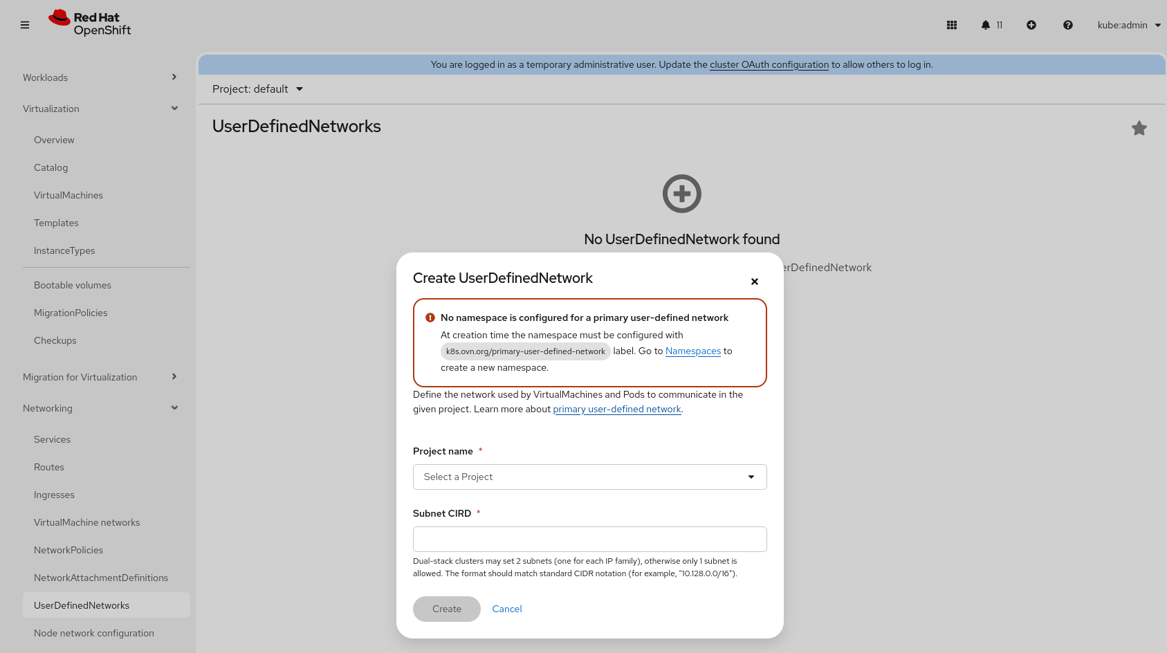 1.Go to Networking -> UserDefinedNetwork -> Create 2. Click primary user-defined network link 3.