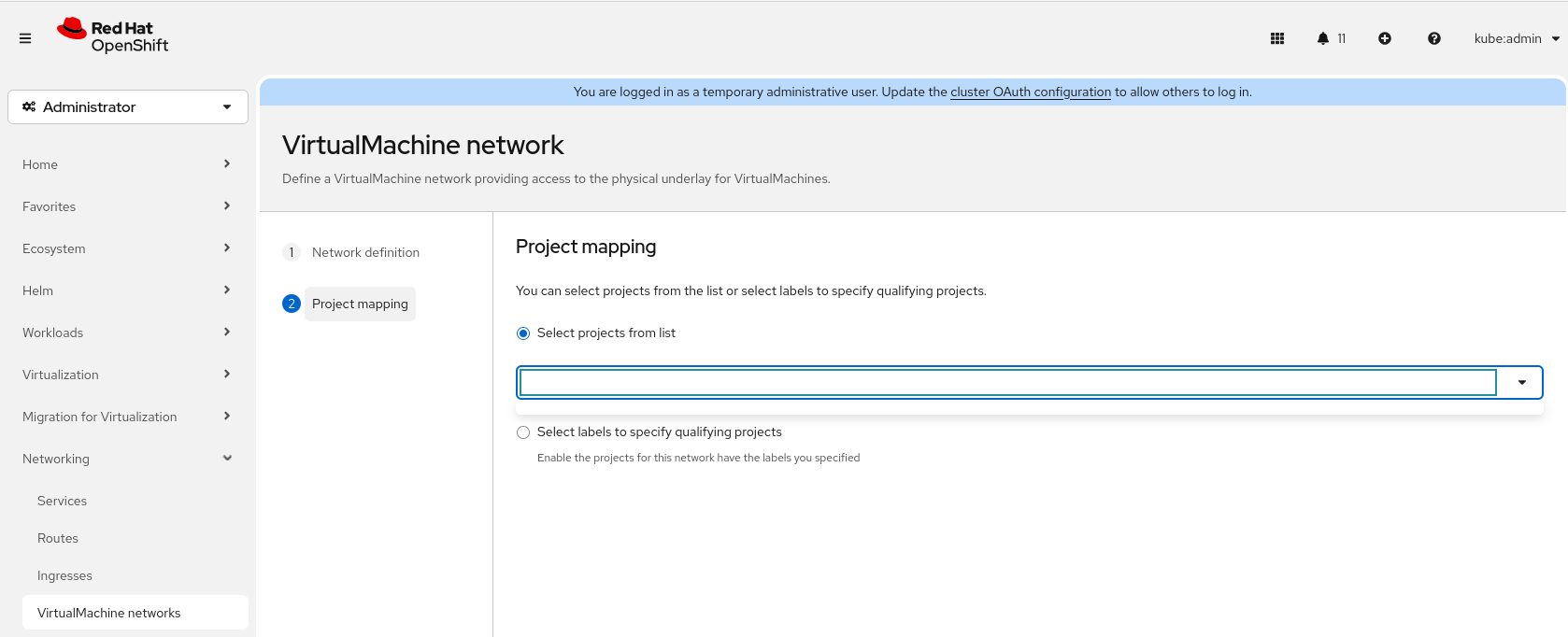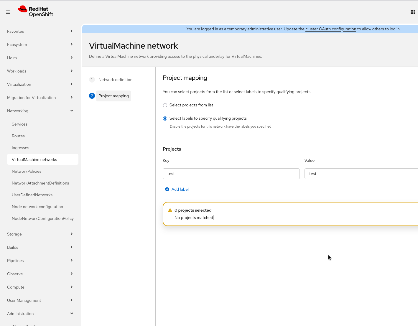 1. Create namespaces with label test=test 2. Go to Networking > VirtualMachin Networks > Create 3. Go to Project Mapping page 4. Select projects from list or 'Select labels to specify qualifying projects', add the test=test label