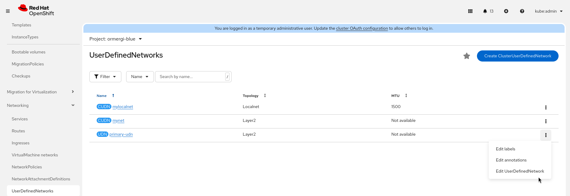 1. Go to Networking > UserDefinedNetwork page 2. Create an object UDN or CUDN 3. Go back to UserDefinedNetwork page 4. Click on the kebab buttion of the UDN object that created on (2)