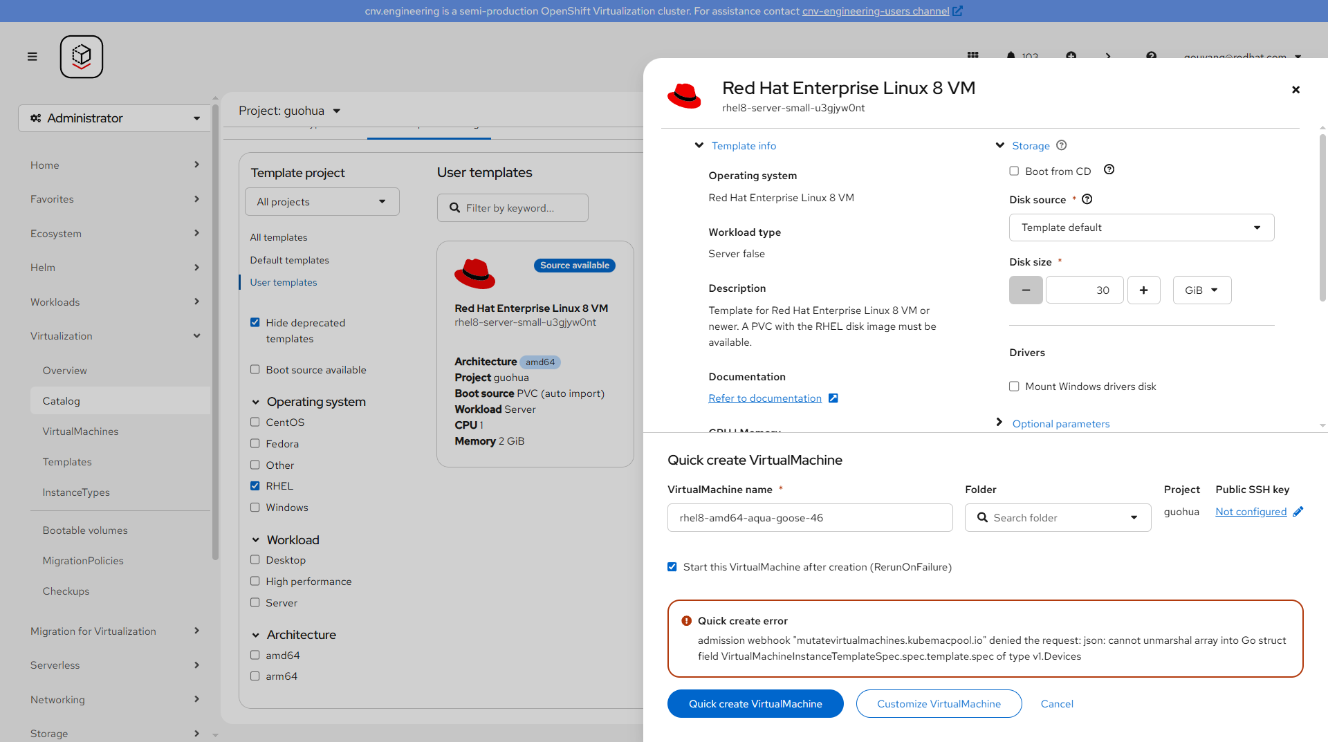 Cannot create VM from template when multiarch feature is enabled, error like below on cnv2 cluster: