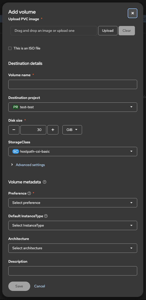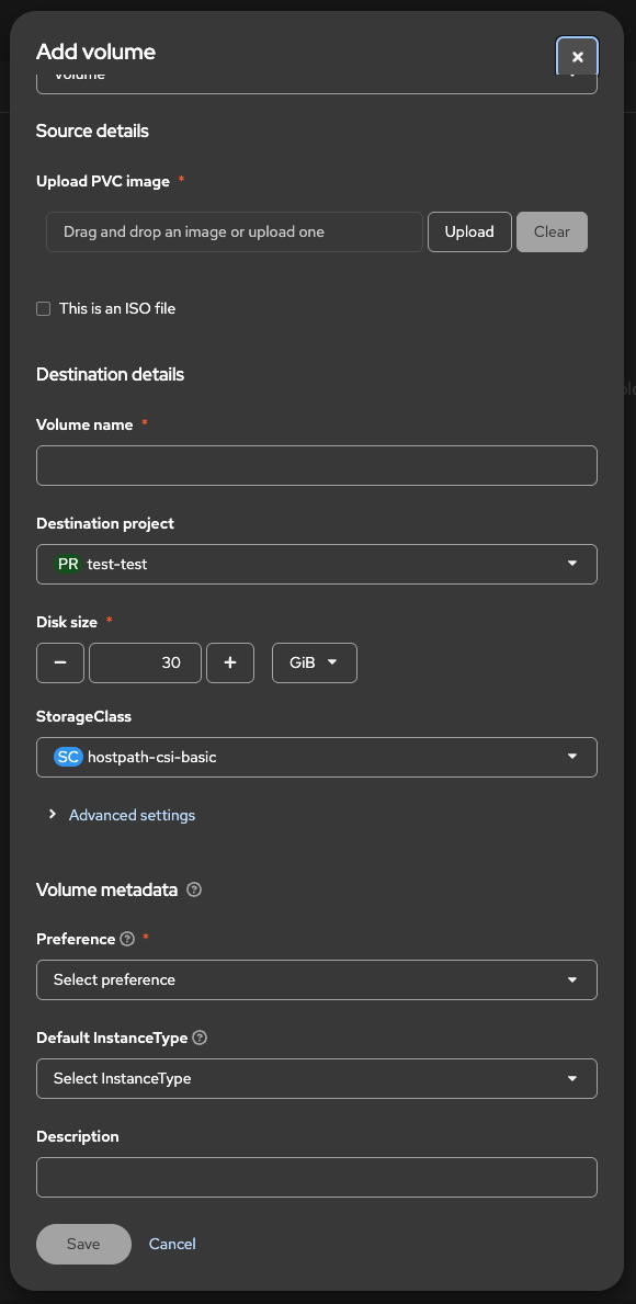1. Login to cluster as test user 2. Navigate to Bootable volumes page, select available proje ct or create a new one 3. Click Add volume button