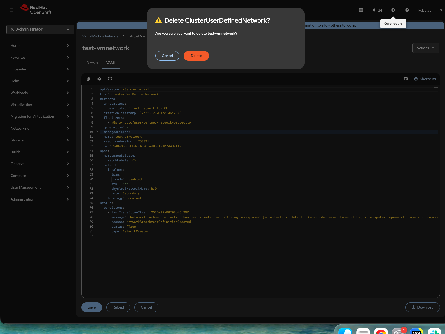 VirtualMachineNetwork is referred to as ClusterUserDefinedNetwork, when deleted