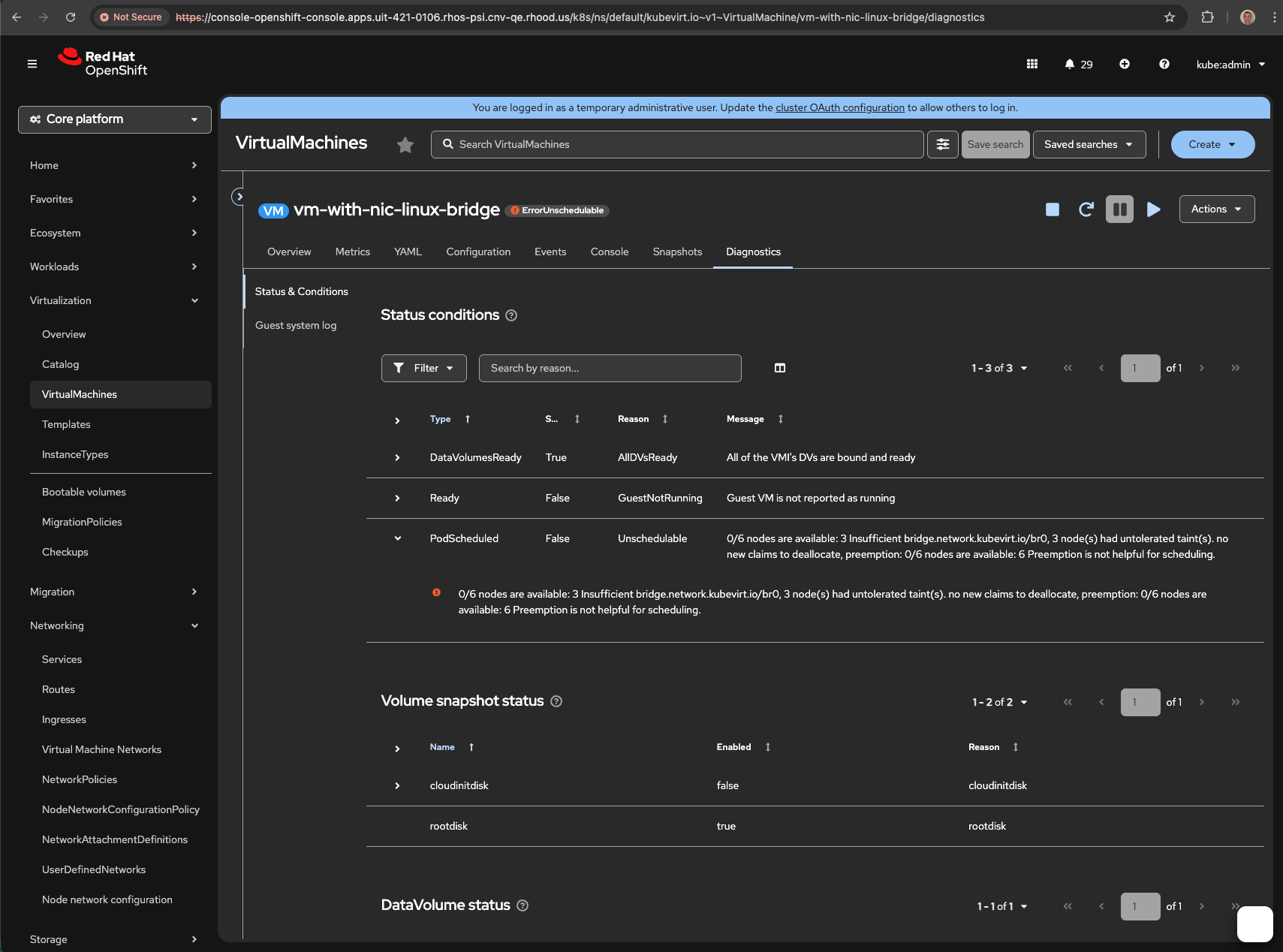 0/6 nodes are available: 3 Insufficient bridge.network.kubevirt.io/br0, 3 node(s) had untolerated taint(s). no new claims to deallocate, preemption: 0/6 nodes are available: 6 Preemption is not helpful for scheduling.