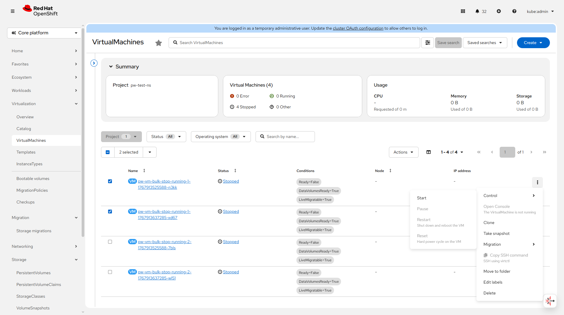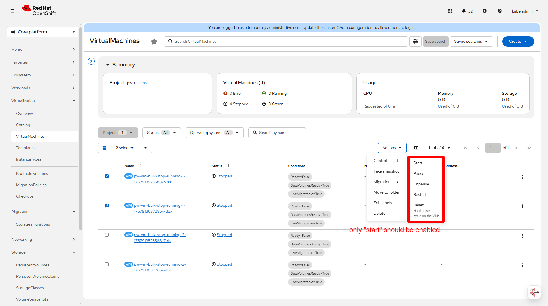 All VM bulk operations are enabled even the action is not performable. Refer to VM kebab actions for good example