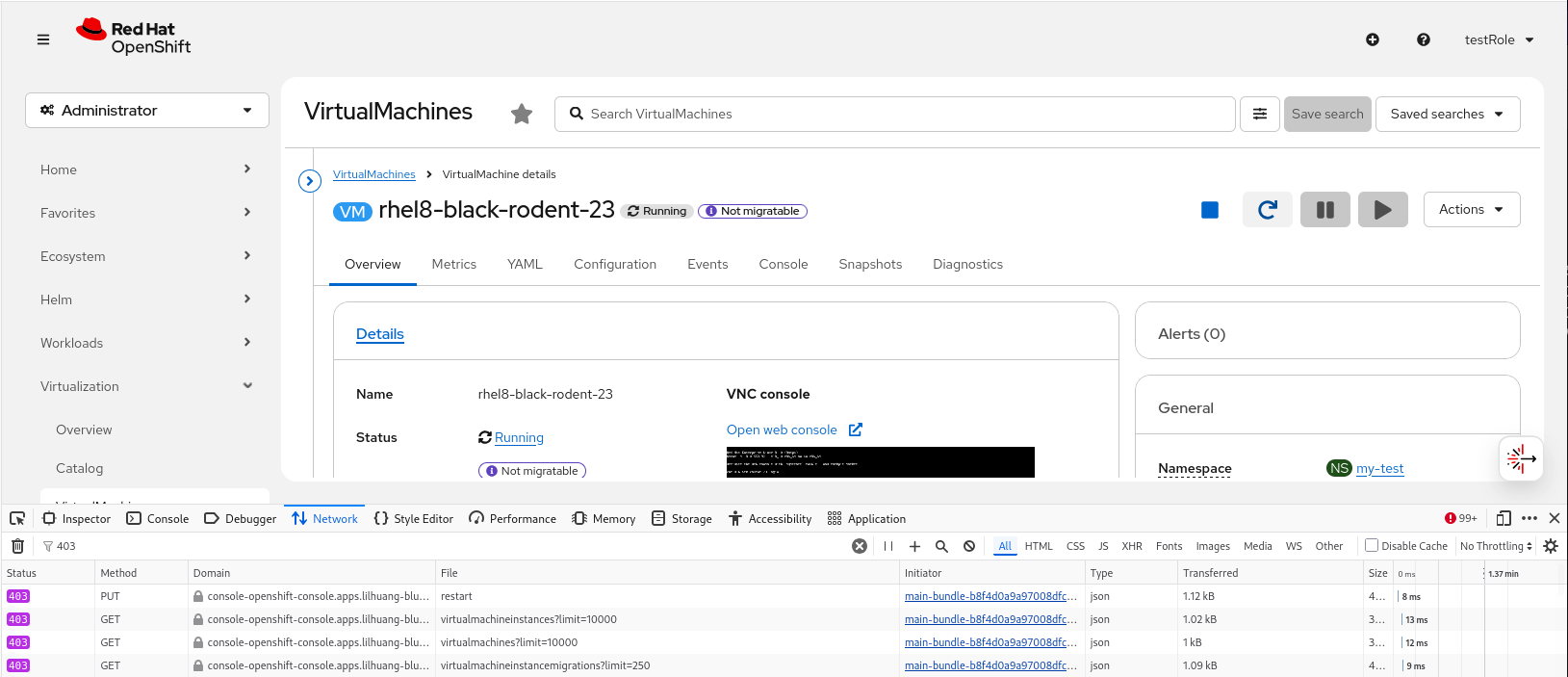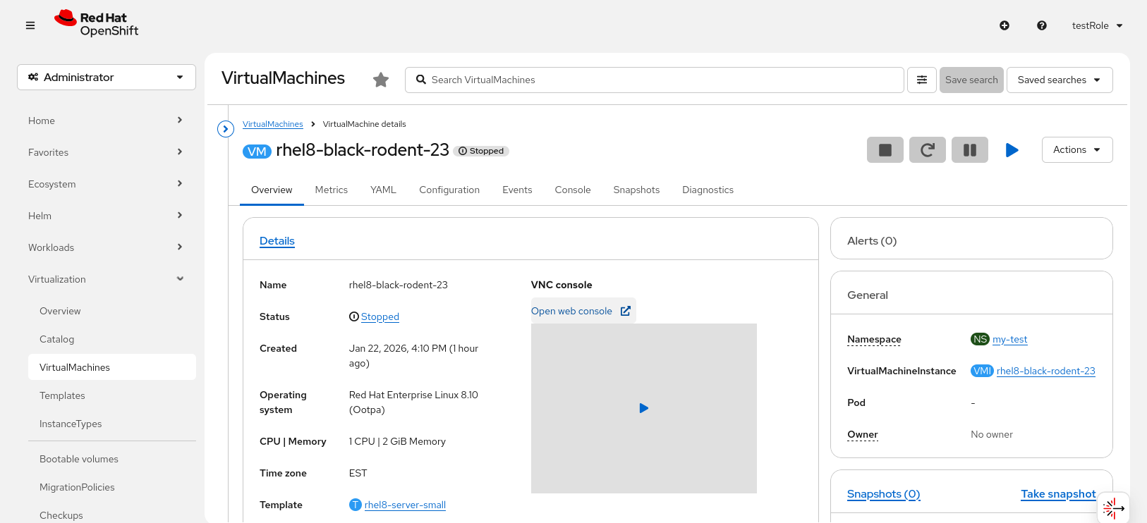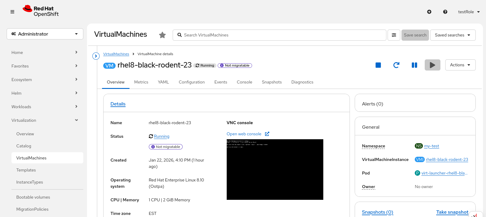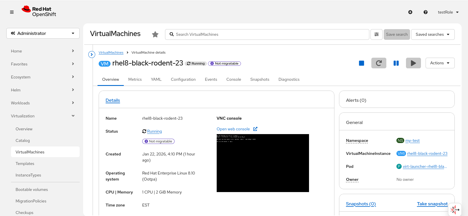 1. Create a VM from the default template like rhel 8 by a admin user in a new project(my-test).