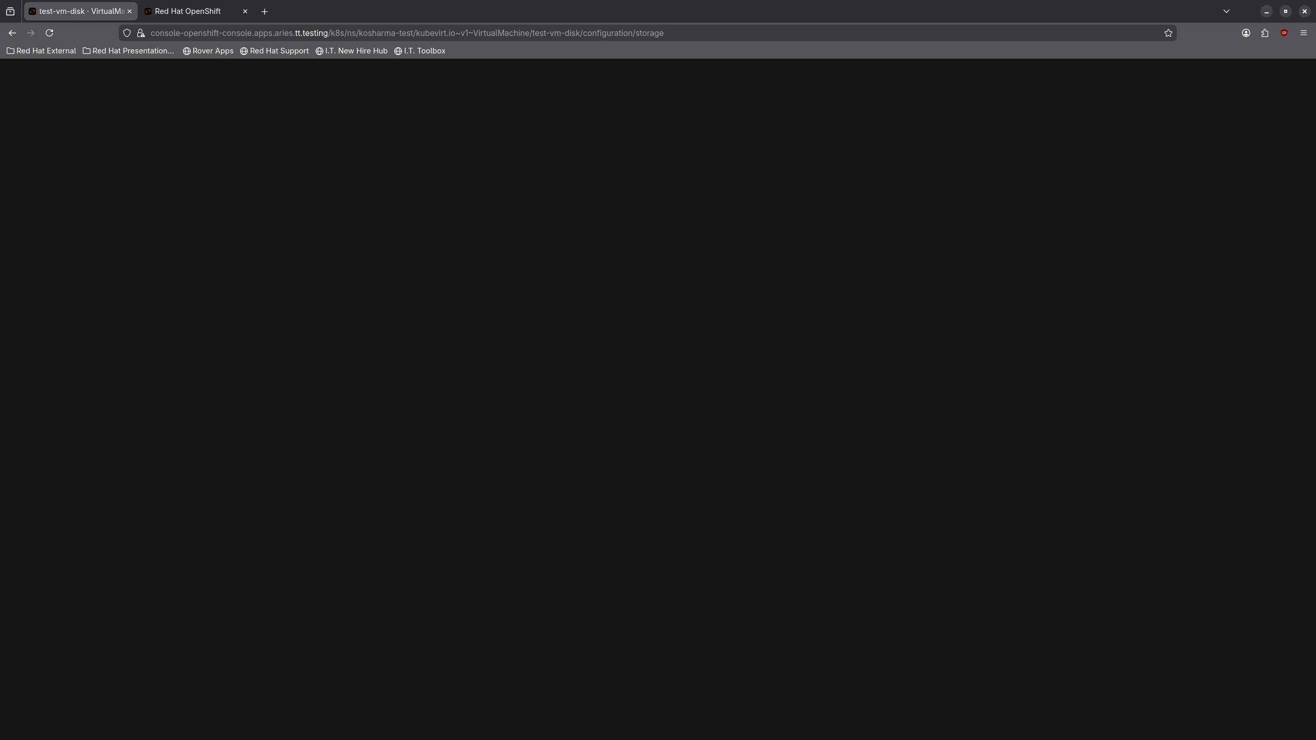 1] Log in to the OpenShift Web Console. 2] Navigate to Virtualization → Virtual Machines. 3] Select a virtual machine. 4] Go to Configurations → Storage. 5] Locate the container disk. 6] Click the three-dot (⋮) menu and select Detach. 7] Observe that the console page turns blank.