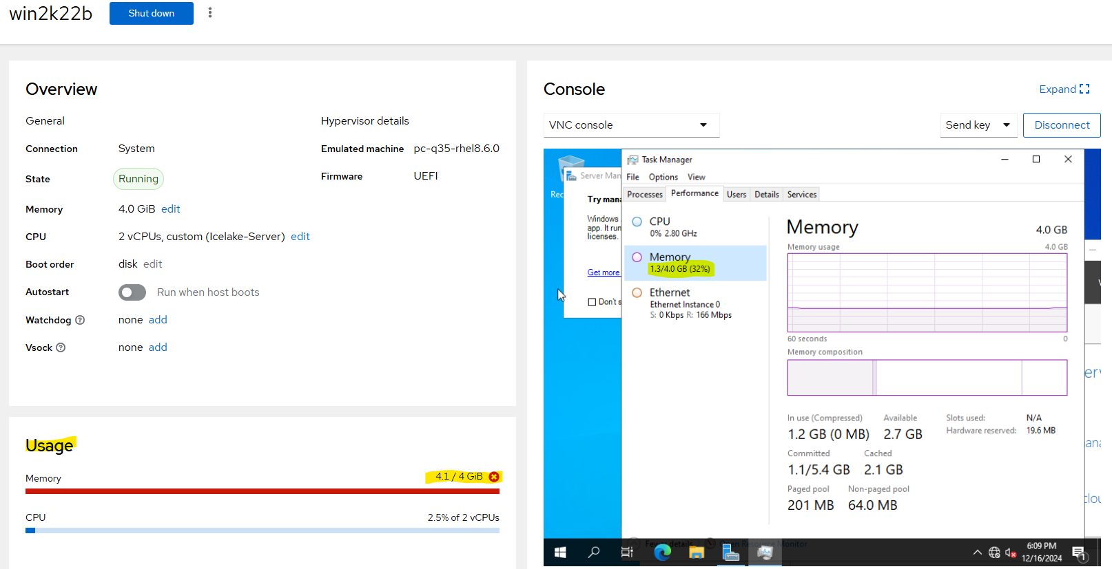 With KVM on RHEL 8.10, the Cockpit UI is displaying 100% memory usage for Windows virtual machines. When reviewing the Windows Resource Monitor the memory usage displayed is significantly lower (example: using only 10% or 20%) versus what is being shown in Cockpit. With a RHEL VM this problem is not seen.