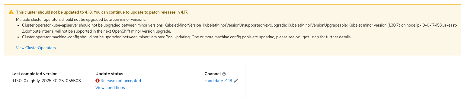 1. Console UI shows a warning bar: This cluster should not be upgrade to 4.18.