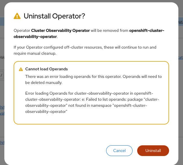 Error loading Operands for cluster-observability-operator in openshift-cluster-observability-operator: e: Failed to list operands: package "cluster-observability-operator" not found in namespace "openshift-cluster-observability-operator"