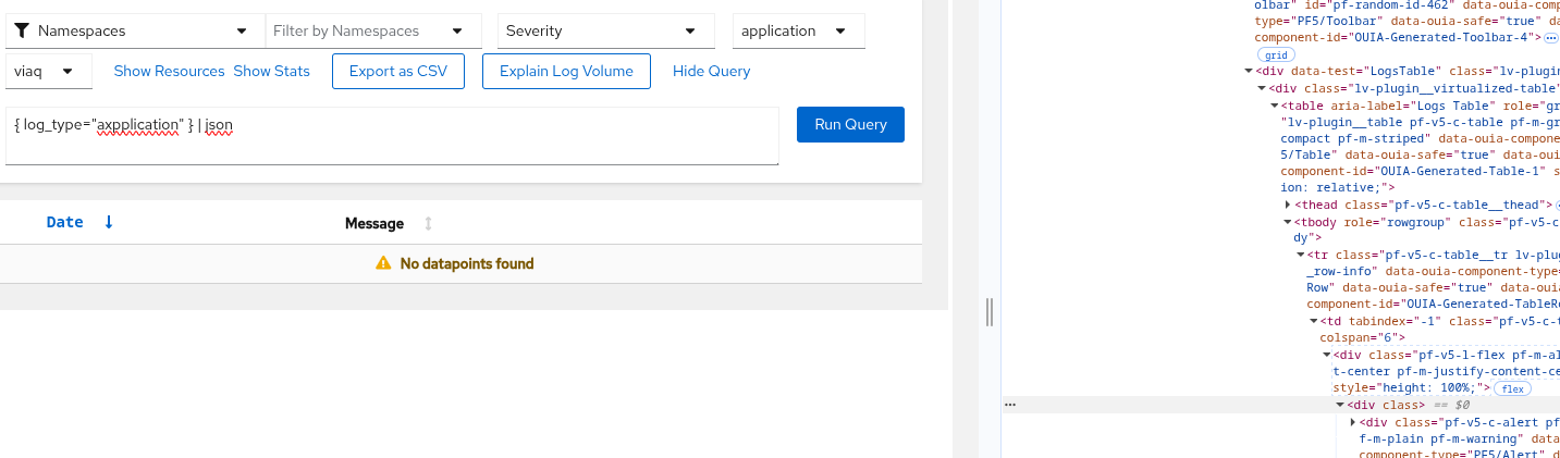 when logTable display ' No datapoints found'. there is one DIV without any class I guess we can define a class like "pf-v5-c-form_alert" or "pf-v5-c-tabel_alert" for it .