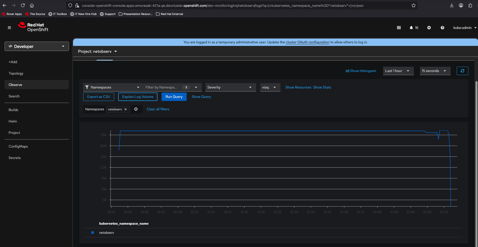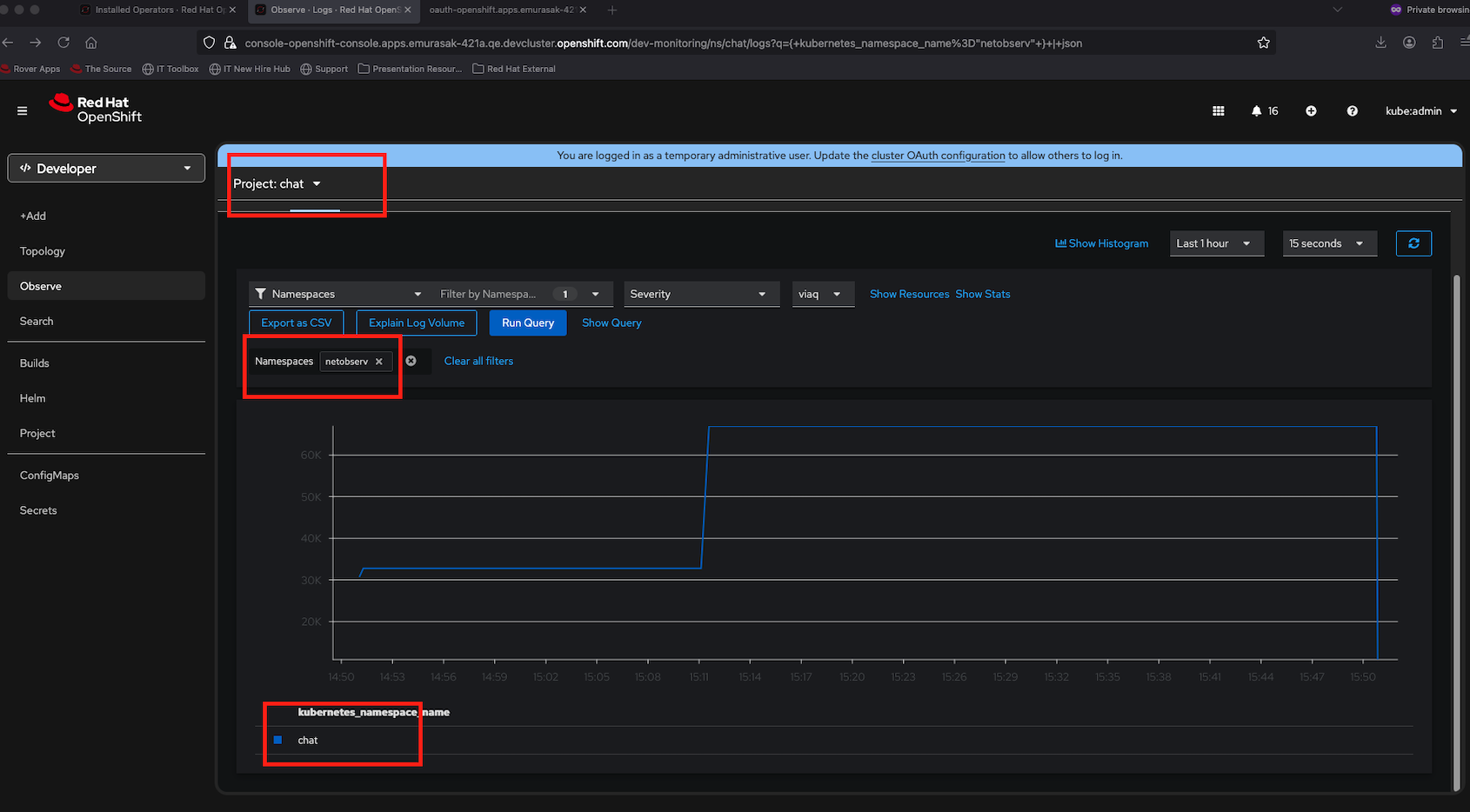 - Go To Observe > Logs => you can see Filtering namespace is already set as chat