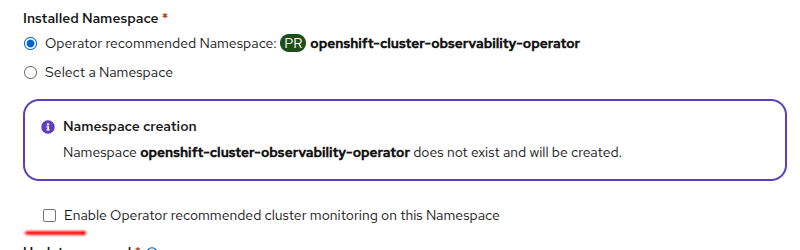 When installing COO via OperatoHub there's a check box to enable cluster monitoring on the particular namespace.