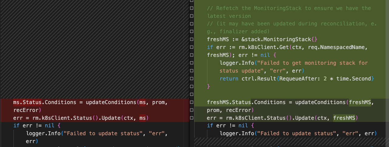 2026-03-09T01:51:57Z ERROR Reconciler error {"controller": "monitoringstack", "controllerGroup": "monitoring.rhobs", "controllerKind": "MonitoringStack", "MonitoringStack": {"name":"valid-retention","namespace":"e2e-tests"}, "namespace": "e2e-tests", "name": "valid-retention", "reconcileID": "2b257dca-4b56-4ed7-846d-4707fe3e2bc0", "error": "Operation cannot be fulfilled on monitoringstacks.monitoring.rhobs \"valid-retention\": StorageError: invalid object, Code: 4, Key: /kubernetes.io/monitoring.rhobs/monitoringstacks/e2e-tests/valid-retention, ResourceVersion: 0, AdditionalErrorMsg: Precondition failed: UID in precondition: 0e729fef-5114-40f4-9039-61760a94f6a8, UID in object meta: "}