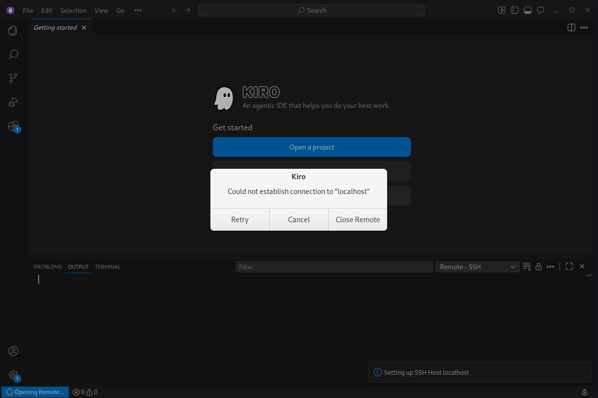 After sign in with Google into Kiro I faced "Failed to connect to the remote extension host server (Error: Too many authentication failures)" error: