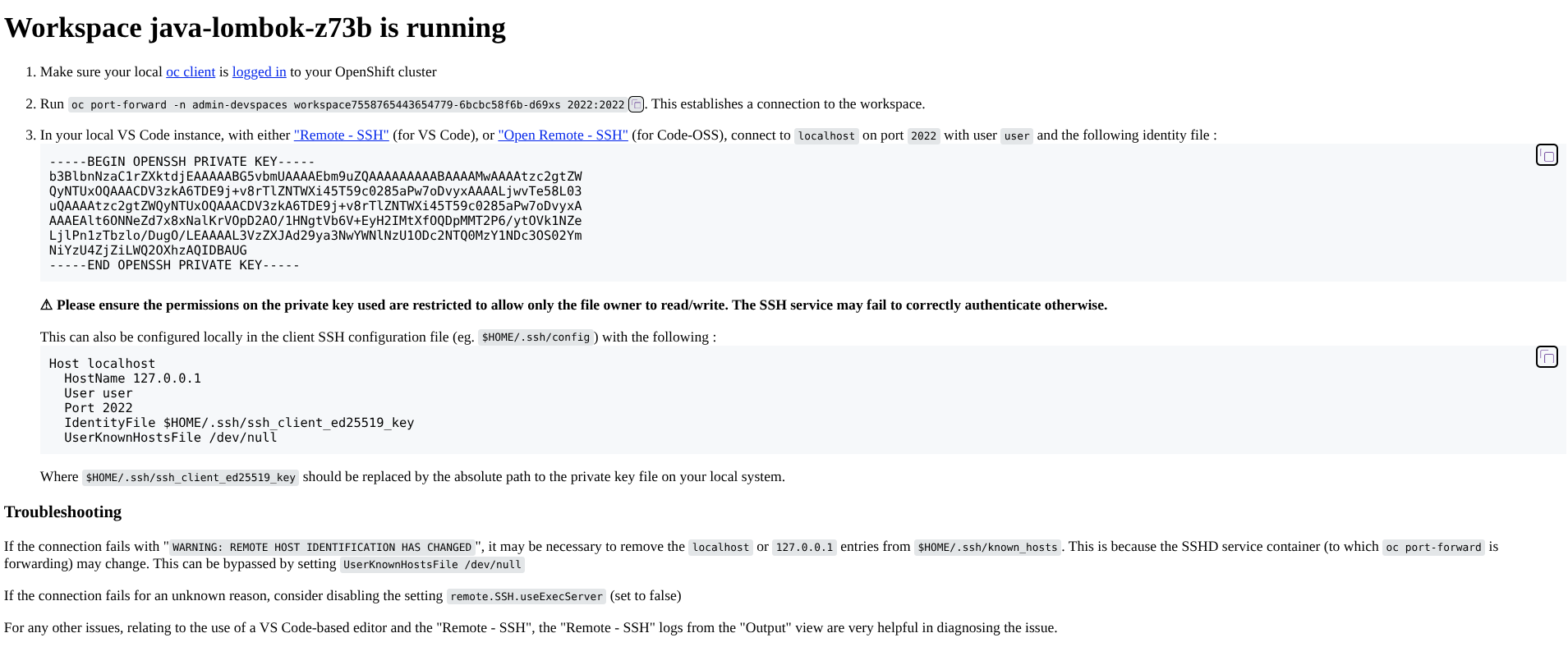 6. After workspace started try to connect to the remote server following instructions from the landing page.
