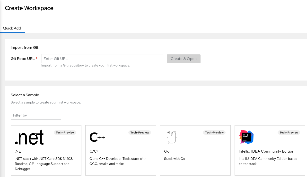 Select a sample to create your first workspace > Select a stack to create your first workspace
