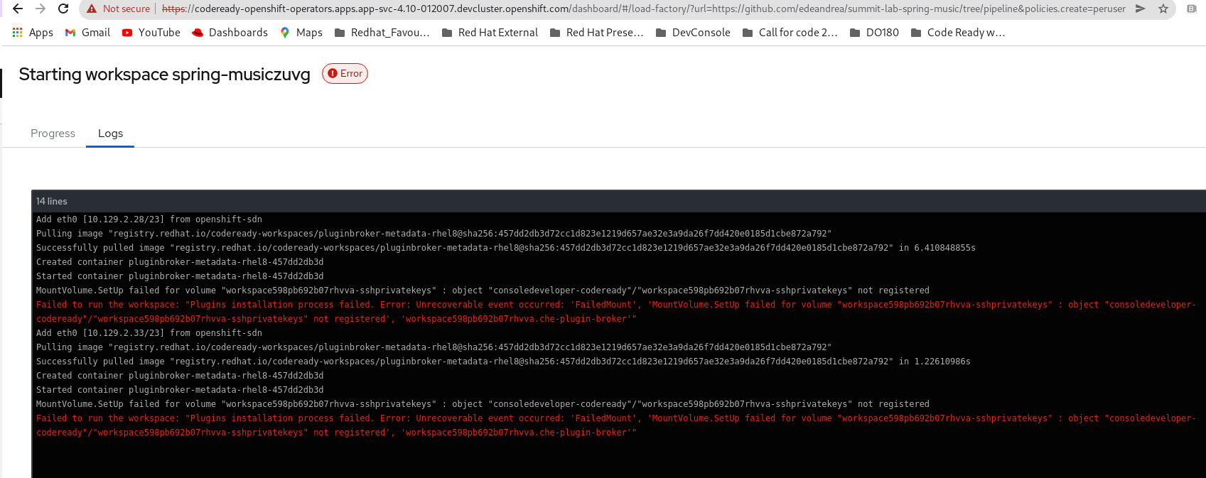 Select the code ready workspaces operator icon of a workload in topology page and workspace is not getting loaded instead failed with error.