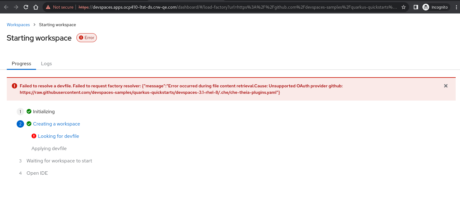 Failed to resolve a devfile. Failed to request factory resolver: {"message":"Error occurred during file content retrieval.Cause: Unsupported OAuth provider github: https://raw.githubusercontent.com/devspaces-samples/quarkus-quickstarts/devspaces-3.1-rhel-8/.che/che-theia-plugins.yaml"}