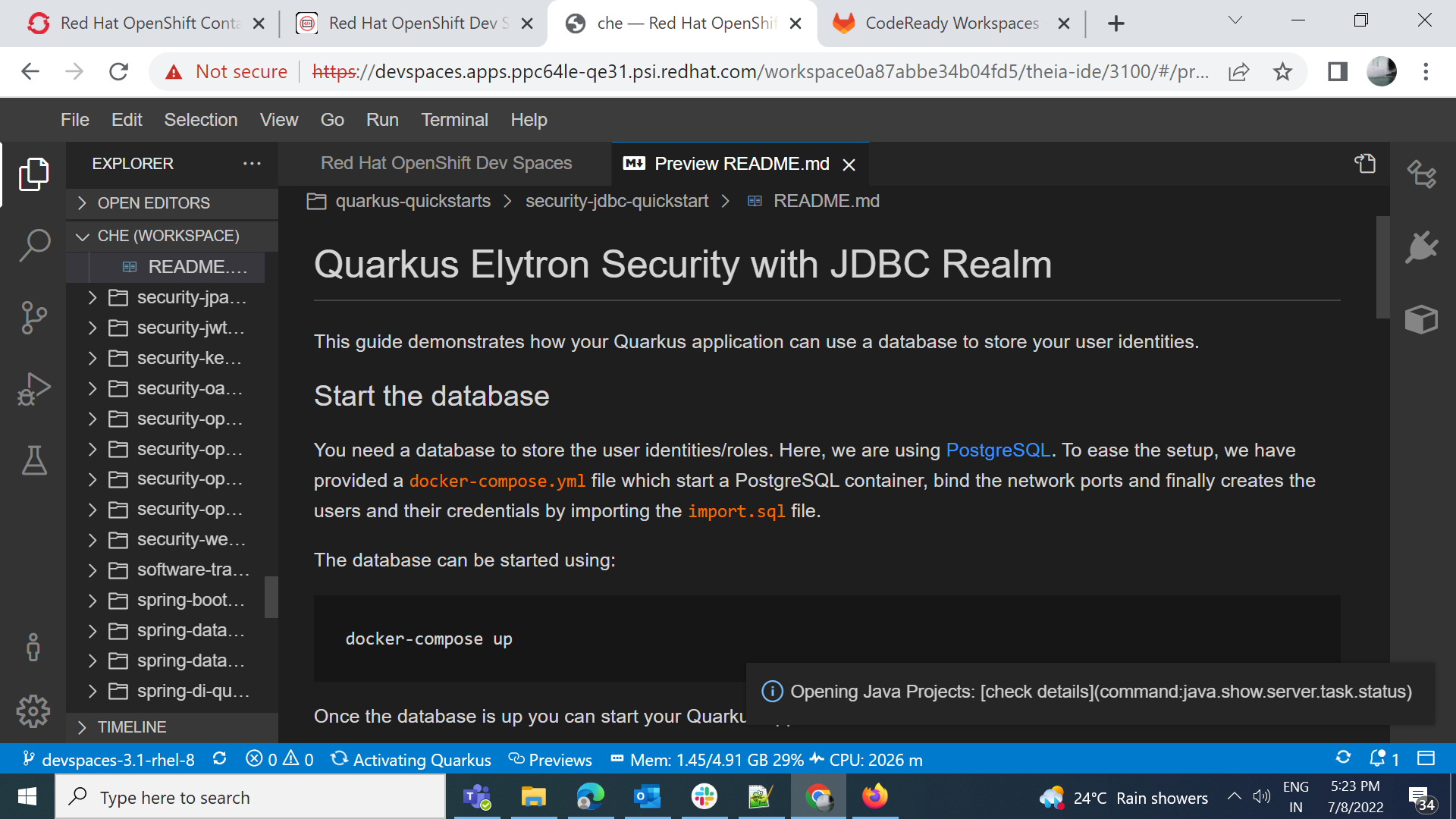 2. Go to Dashboard GUI > Create Workspace page and create workspace using factory url https://github.com/devspaces-samples/quarkus-quickstarts/tree/devspaces-3.1-rhel-8