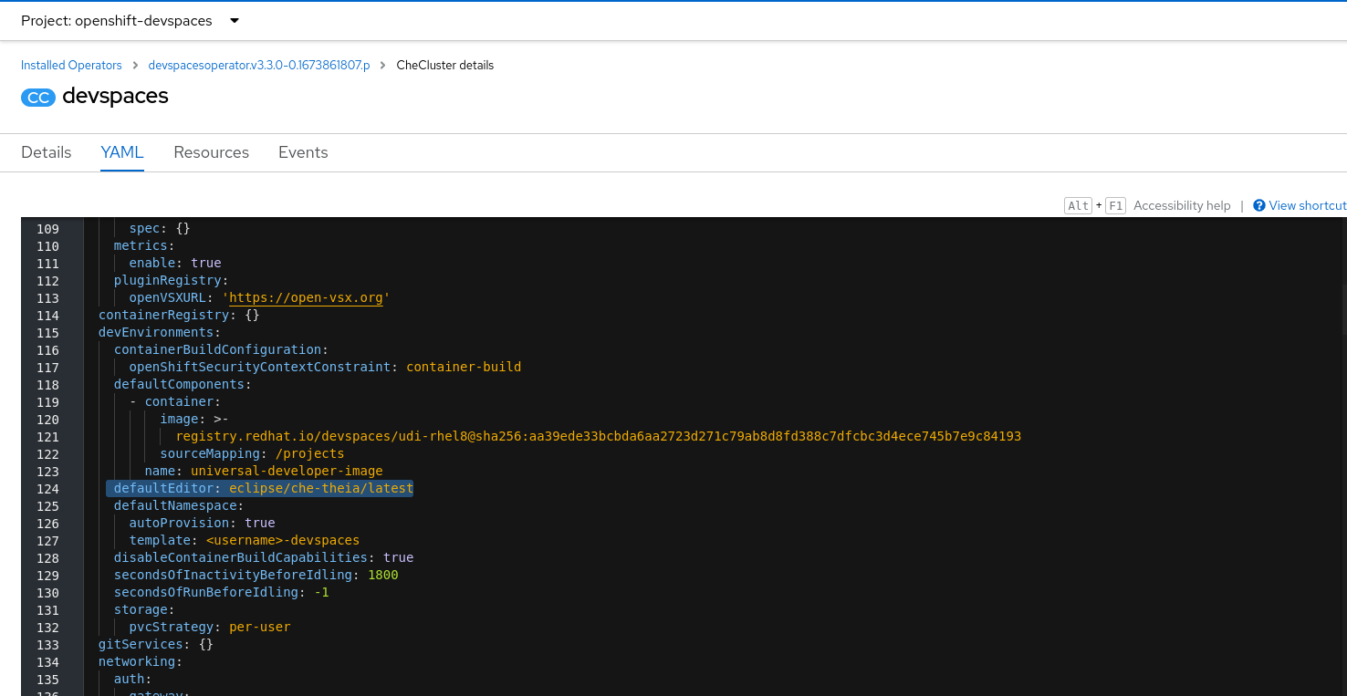 - Set defaultEditor to theia in checluster CR