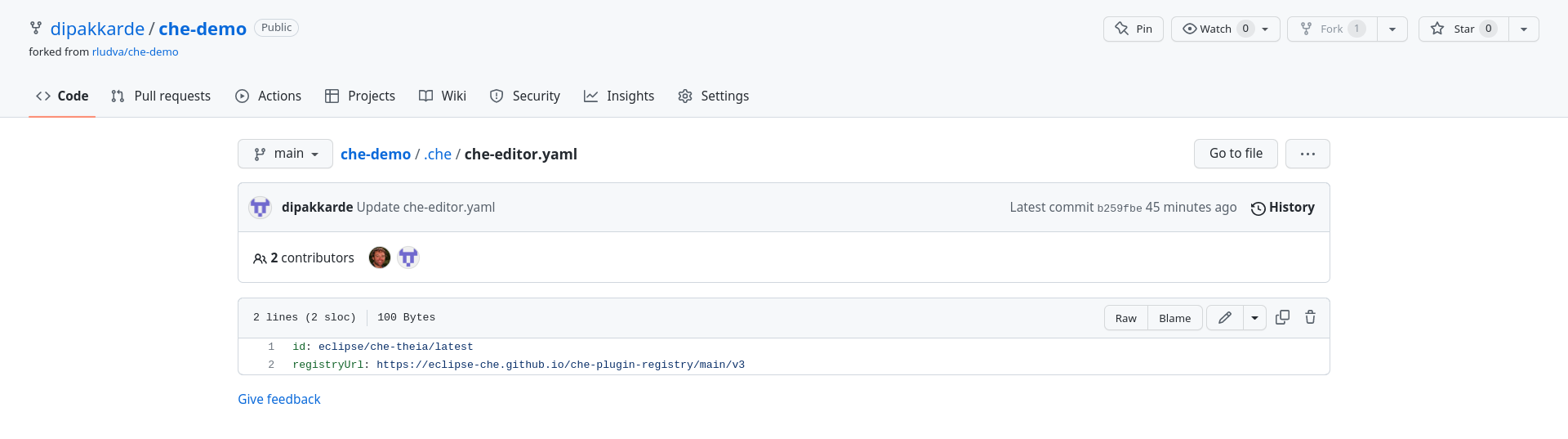 - Set ".che/che-editor.yaml" to eclipse/che-theia/latest