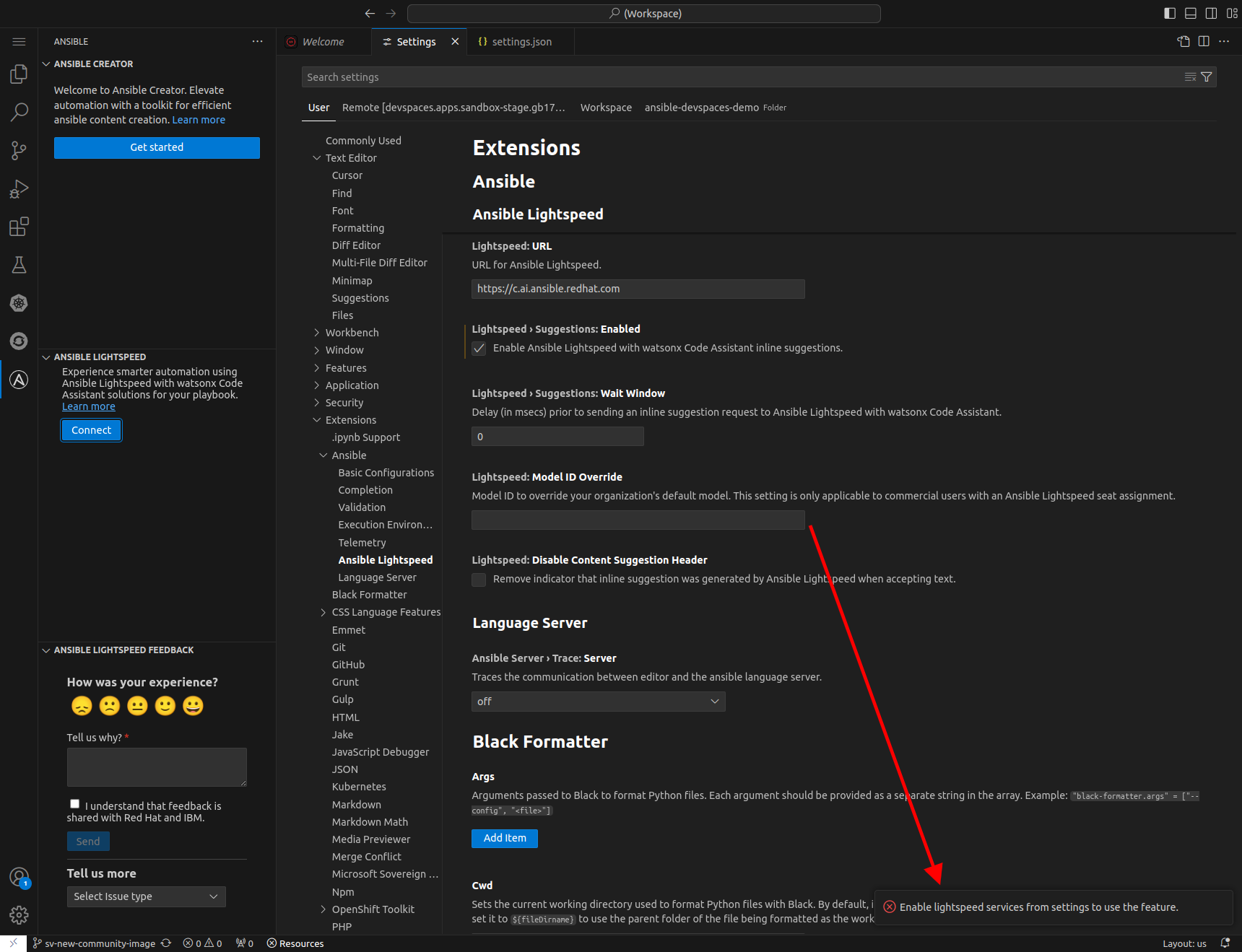 "ansible.lightspeed.enabled": true