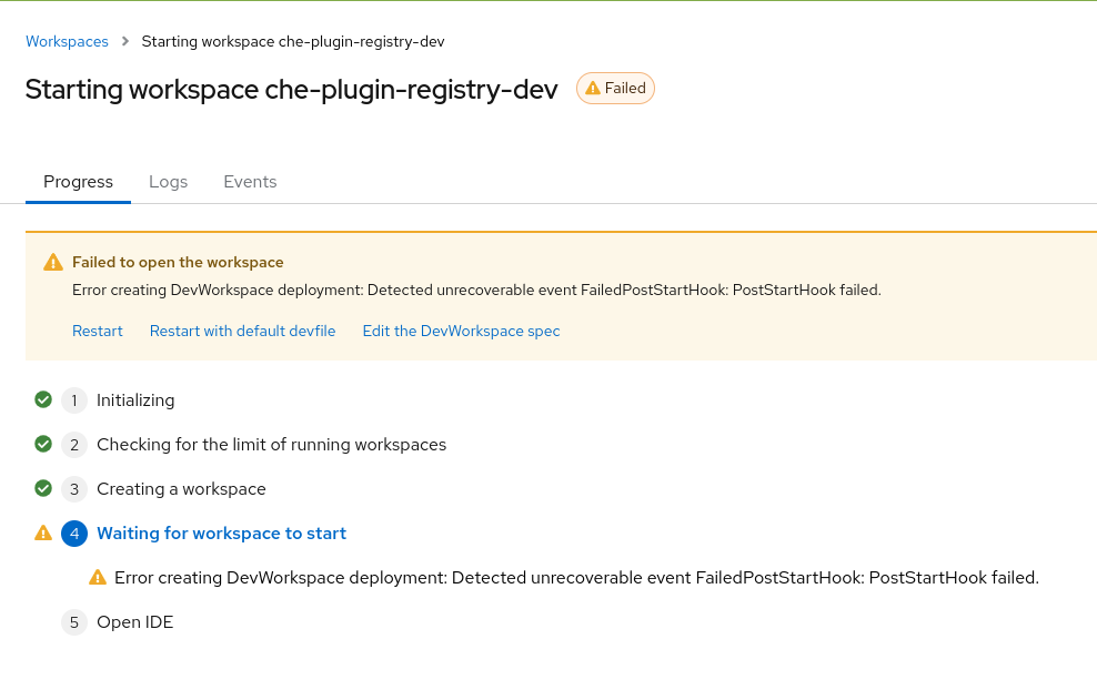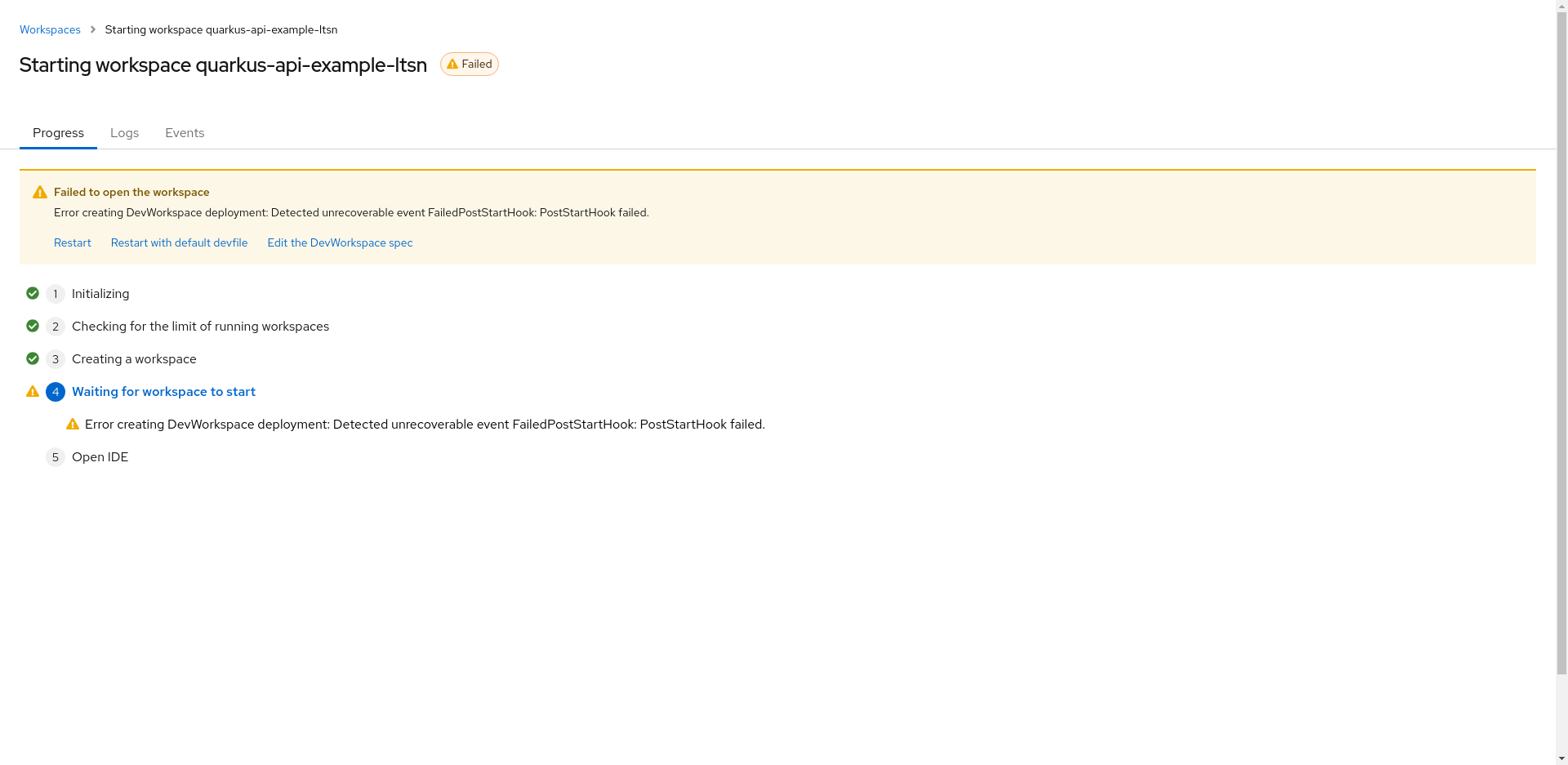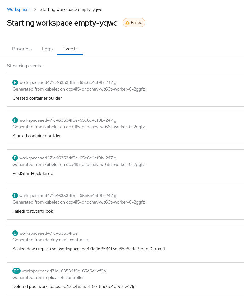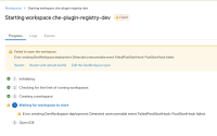 Sometimes Dev Spaces 3.14.0 start workspace page doesn't provide enough additional information when workspace failed to start because of 'Error creating DevWorkspace deployment: Detected unrecoverable event FailedPostStartHook: PostStartHook failed.'.