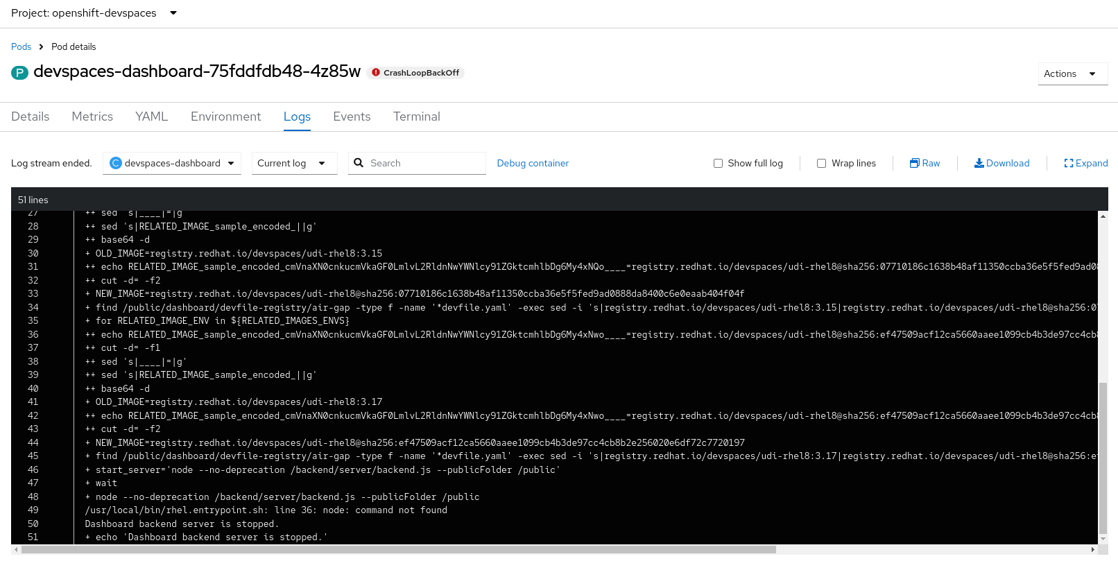 Starting Dashboard backend server... + echo 'Starting Dashboard backend server...' + SAMPLES_DIR=/public/dashboard/devfile-registry/air-gap + find /public/dashboard/devfile-registry/air-gap -type f '(' -name index.json -o -name '*devfile.yaml' ')' -exec sed -i 's|CHE_DASHBOARD_INTERNAL_URL|http://devspaces-dashboard.openshift-devspaces.svc:8080|g' '{}' ';' ++ env ++ grep RELATED_IMAGE_sample_encoded_ + RELATED_IMAGES_ENVS='RELATED_IMAGE_sample_encoded_cmVnaXN0cnkucmVkaGF0LmlvL3Joc2NsL21vbmdvZGItMzYtcmhlbDc6MS01MAo____=registry.redhat.io/rhscl/mongodb-36-rhel7@sha256:9f799d356d7d2e442bde9d401b720600fd9059a3d8eefea6f3b2ffa721c0dc73 RELATED_IMAGE_sample_encoded_cmVnaXN0cnkucmVkaGF0LmlvL2RldnNwYWNlcy91ZGktcmhlbDg6My4xNQo____=registry.redhat.io/devspaces/udi-rhel8@sha256:07710186c1638b48af11350ccba36e5f5fed9ad0888da8400c6e0eaab404f04f RELATED_IMAGE_sample_encoded_cmVnaXN0cnkucmVkaGF0LmlvL2RldnNwYWNlcy91ZGktcmhlbDg6My4xNwo____=registry.redhat.io/devspaces/udi-rhel8@sha256:ef47509acf12ca5660aaee1099cb4b3de97cc4cb8b2e256020e6df72c7720197' + '[' -n 'RELATED_IMAGE_sample_encoded_cmVnaXN0cnkucmVkaGF0LmlvL3Joc2NsL21vbmdvZGItMzYtcmhlbDc6MS01MAo____=registry.redhat.io/rhscl/mongodb-36-rhel7@sha256:9f799d356d7d2e442bde9d401b720600fd9059a3d8eefea6f3b2ffa721c0dc73 RELATED_IMAGE_sample_encoded_cmVnaXN0cnkucmVkaGF0LmlvL2RldnNwYWNlcy91ZGktcmhlbDg6My4xNQo____=registry.redhat.io/devspaces/udi-rhel8@sha256:07710186c1638b48af11350ccba36e5f5fed9ad0888da8400c6e0eaab404f04f RELATED_IMAGE_sample_encoded_cmVnaXN0cnkucmVkaGF0LmlvL2RldnNwYWNlcy91ZGktcmhlbDg6My4xNwo____=registry.redhat.io/devspaces/udi-rhel8@sha256:ef47509acf12ca5660aaee1099cb4b3de97cc4cb8b2e256020e6df72c7720197' ']' + for RELATED_IMAGE_ENV in ${RELATED_IMAGES_ENVS} ++ echo RELATED_IMAGE_sample_encoded_cmVnaXN0cnkucmVkaGF0LmlvL3Joc2NsL21vbmdvZGItMzYtcmhlbDc6MS01MAo____=registry.redhat.io/rhscl/mongodb-36-rhel7@sha256:9f799d356d7d2e442bde9d401b720600fd9059a3d8eefea6f3b2ffa721c0dc73 ++ cut -d= -f1 ++ sed 's|____|=|g' ++ sed 's|RELATED_IMAGE_sample_encoded_||g' ++ base64 -d + OLD_IMAGE=registry.redhat.io/rhscl/mongodb-36-rhel7:1-50 ++ echo RELATED_IMAGE_sample_encoded_cmVnaXN0cnkucmVkaGF0LmlvL3Joc2NsL21vbmdvZGItMzYtcmhlbDc6MS01MAo____=registry.redhat.io/rhscl/mongodb-36-rhel7@sha256:9f799d356d7d2e442bde9d401b720600fd9059a3d8eefea6f3b2ffa721c0dc73 ++ cut -d= -f2 + NEW_IMAGE=registry.redhat.io/rhscl/mongodb-36-rhel7@sha256:9f799d356d7d2e442bde9d401b720600fd9059a3d8eefea6f3b2ffa721c0dc73 + find /public/dashboard/devfile-registry/air-gap -type f -name '*devfile.yaml' -exec sed -i 's|registry.redhat.io/rhscl/mongodb-36-rhel7:1-50|registry.redhat.io/rhscl/mongodb-36-rhel7@sha256:9f799d356d7d2e442bde9d401b720600fd9059a3d8eefea6f3b2ffa721c0dc73|g' '{}' ';' + for RELATED_IMAGE_ENV in ${RELATED_IMAGES_ENVS} ++ echo RELATED_IMAGE_sample_encoded_cmVnaXN0cnkucmVkaGF0LmlvL2RldnNwYWNlcy91ZGktcmhlbDg6My4xNQo____=registry.redhat.io/devspaces/udi-rhel8@sha256:07710186c1638b48af11350ccba36e5f5fed9ad0888da8400c6e0eaab404f04f ++ cut -d= -f1 ++ sed 's|____|=|g'