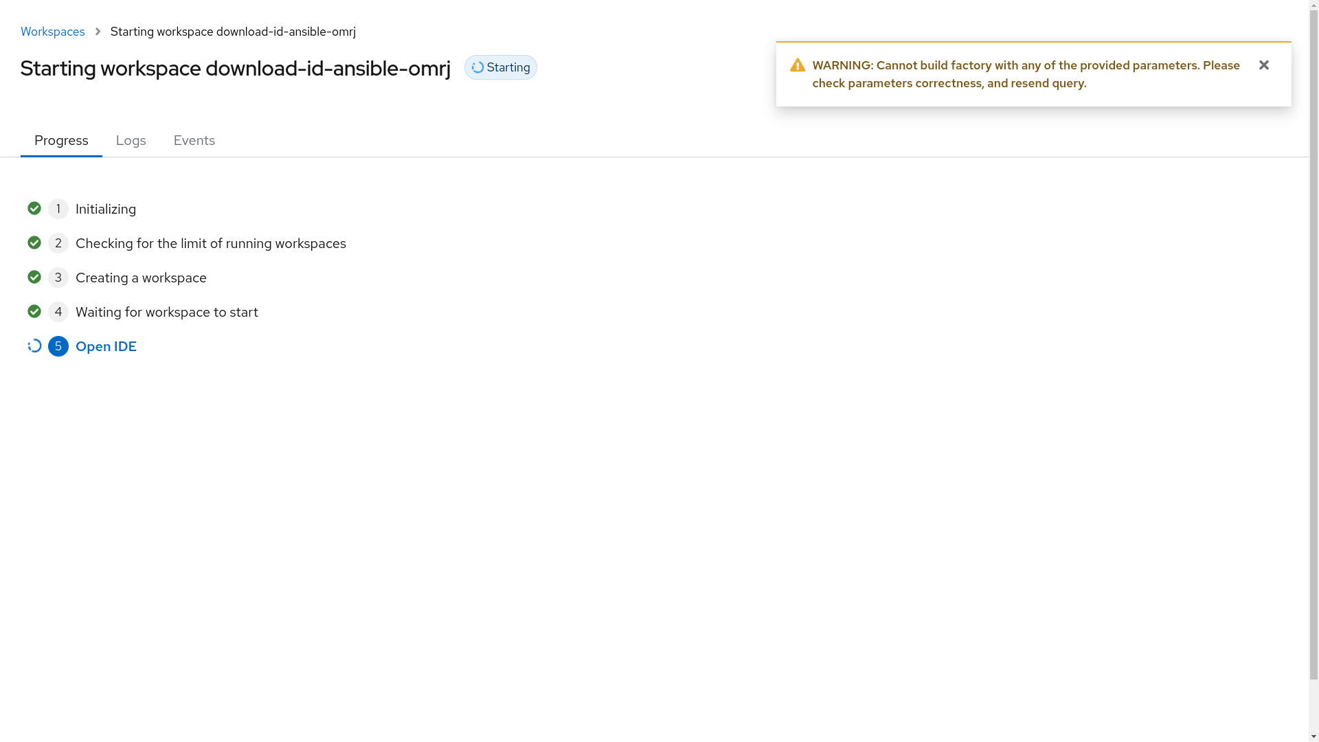 Start workspace page showed warning.
