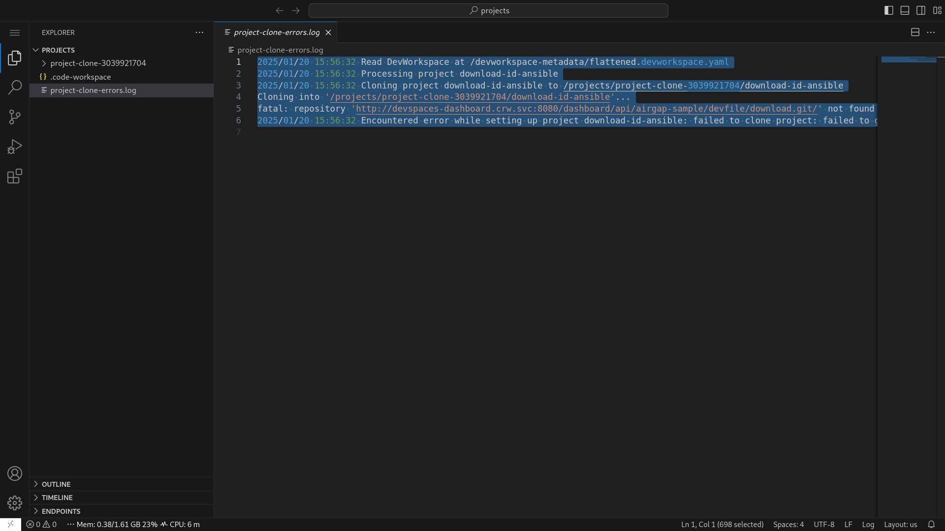 2025/01/20 15:56:32 Encountered error while setting up project download-id-ansible: failed to clone project: failed to git clone from http://devspaces-dashboard.crw.svc:8080/dashboard/api/airgap-sample/devfile/download.git: exit status 128