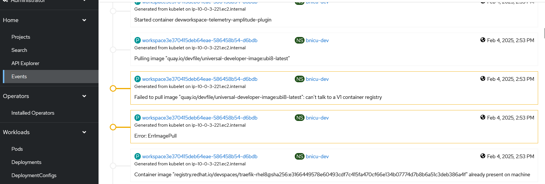 Failed to pull image "quay.io/devfile/universal-developer-image:ubi8-latest": can't talk to a V1 container registry