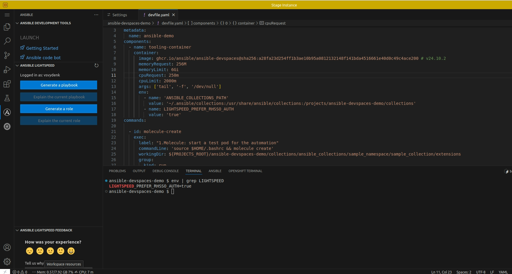 - Create and open Ansible sample in VS Code Editor from "User Dashboard > Create Workspace" page.