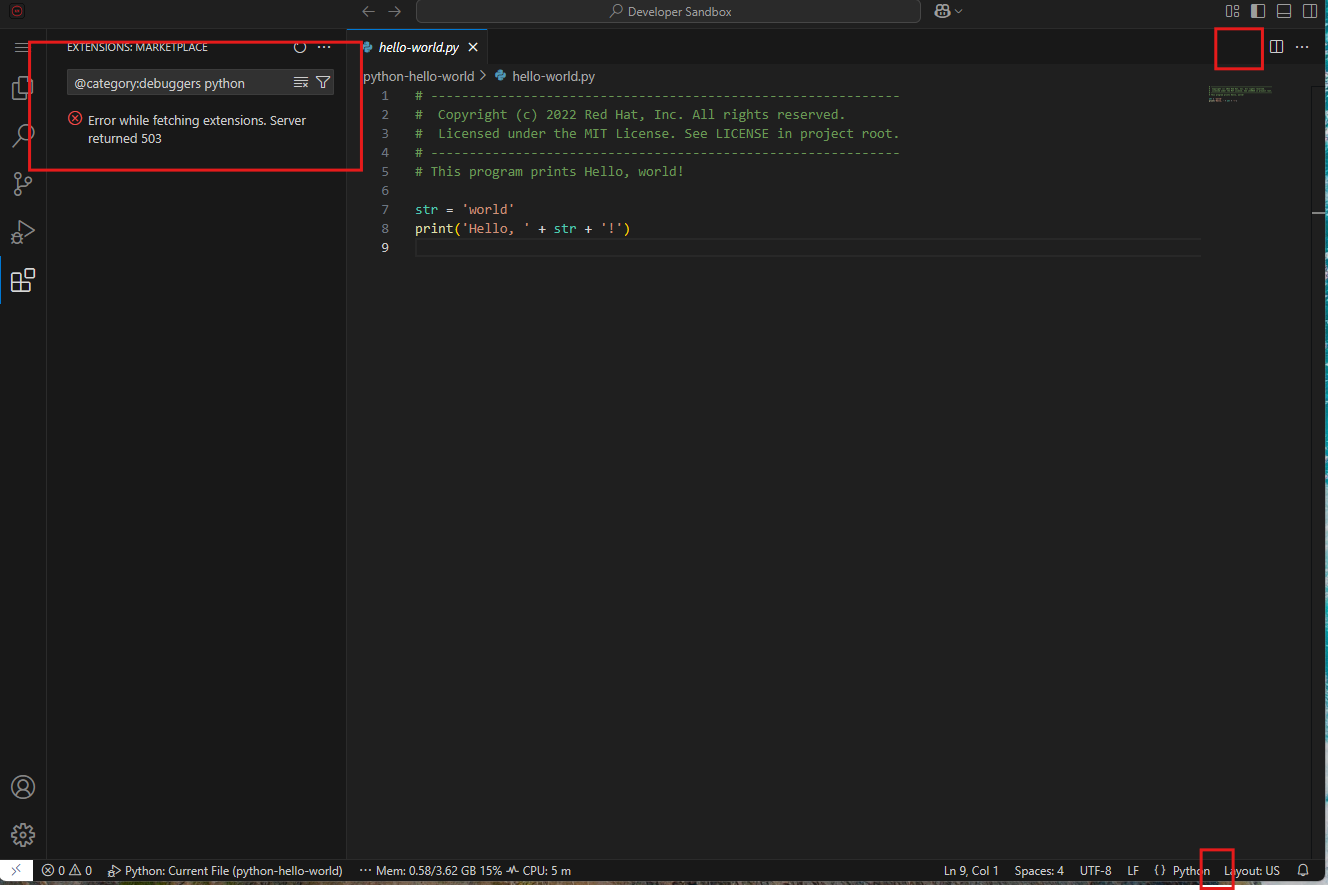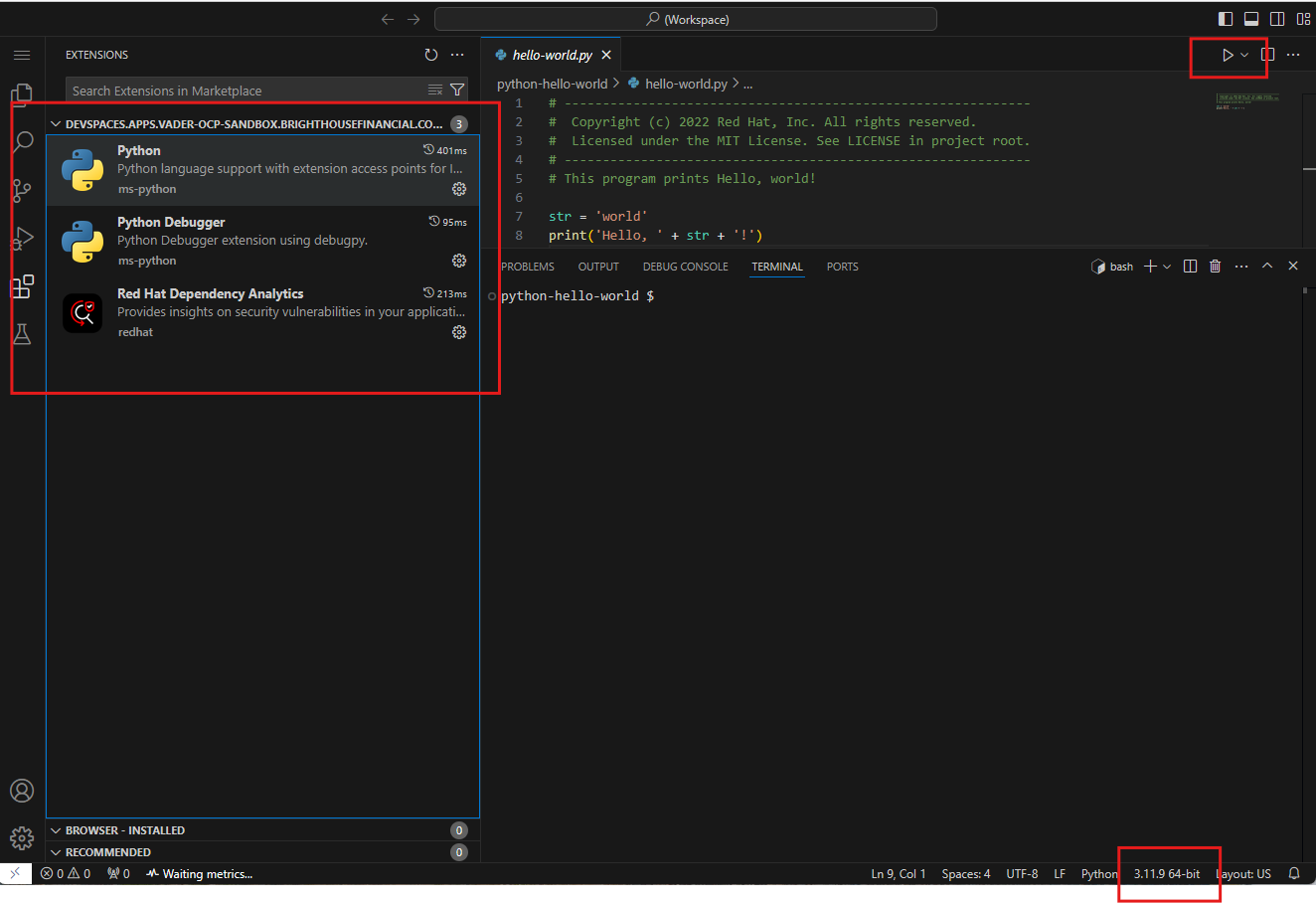 open the hello-world.py file and observe that the page does not show the green 'play' button nor the python version in the status bar on the bottom right