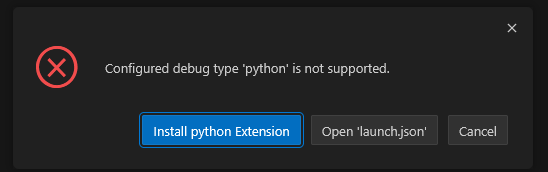 Observe the dialog that says 'Configured debug type 'python' is not supported.'