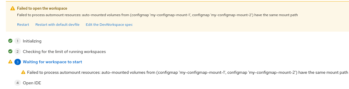 https://github.com/devfile/devworkspace-operator[DevWorkspace Operator] version. When two automount configmaps or secrets share the same mount path with `controller.devfile.io/mount-as: subpath`, an error message will appear when you try to start a DevWorkspace.