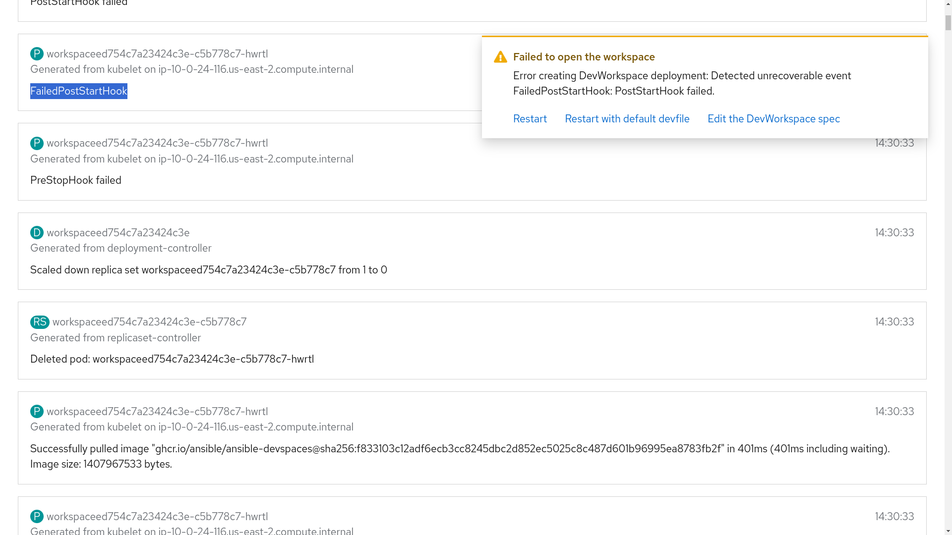 = "PostStartHook failed" error There is a known issue with using the Ansible sample on the `arm64`architecture. The Ansible sample fails to start and the following error message appears: "Error creating DevWorkspace deployment: Detected unrecoverable event FailedPostStartHook: PostStartHook failed." There is no workaround available.