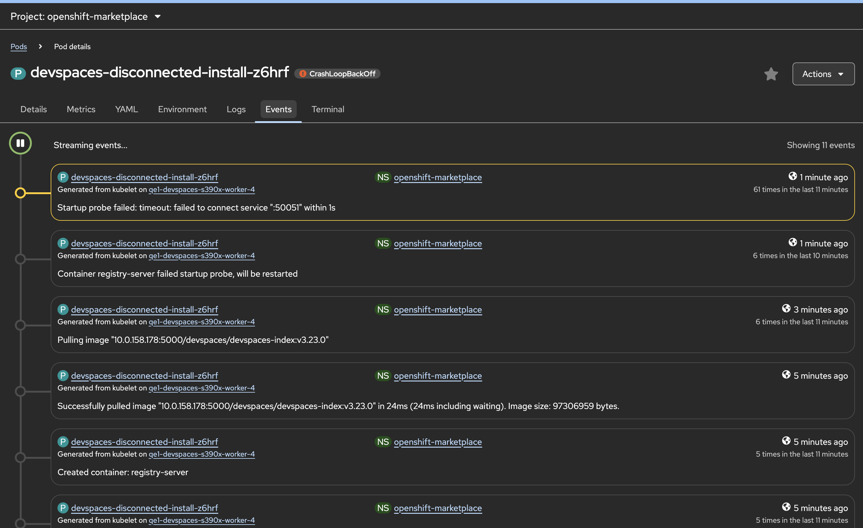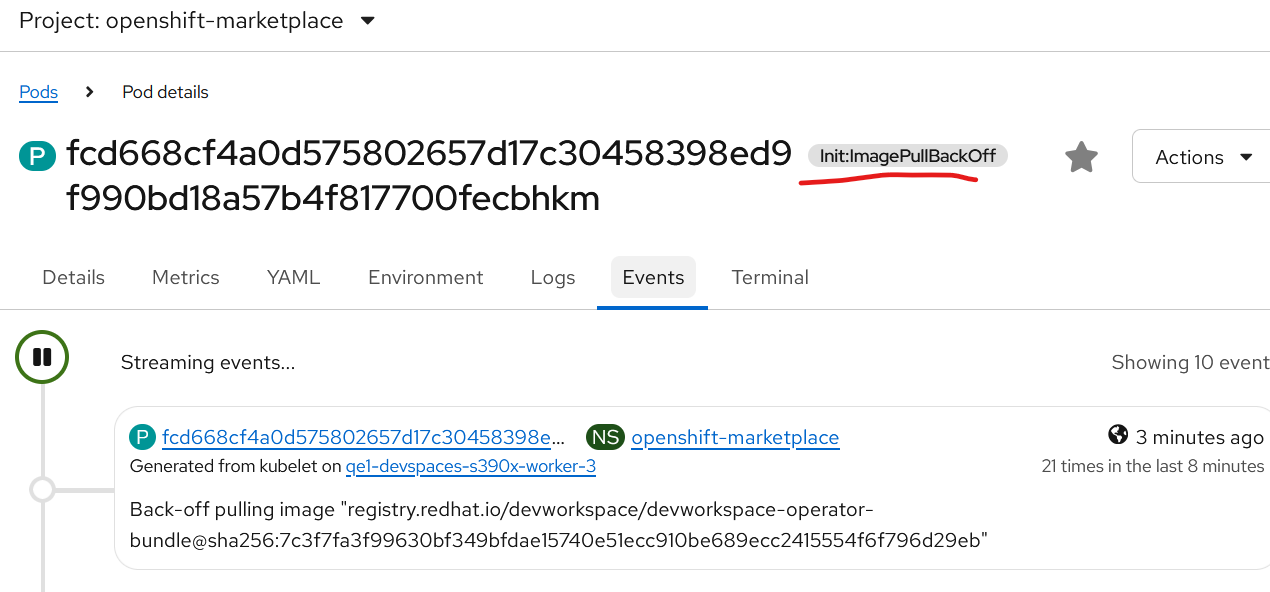 and found "devworkspace/devworkspace-operator-bundle" is amd64 only, which make the pod of the CatalogSource is not started as shown by the following snapshot.