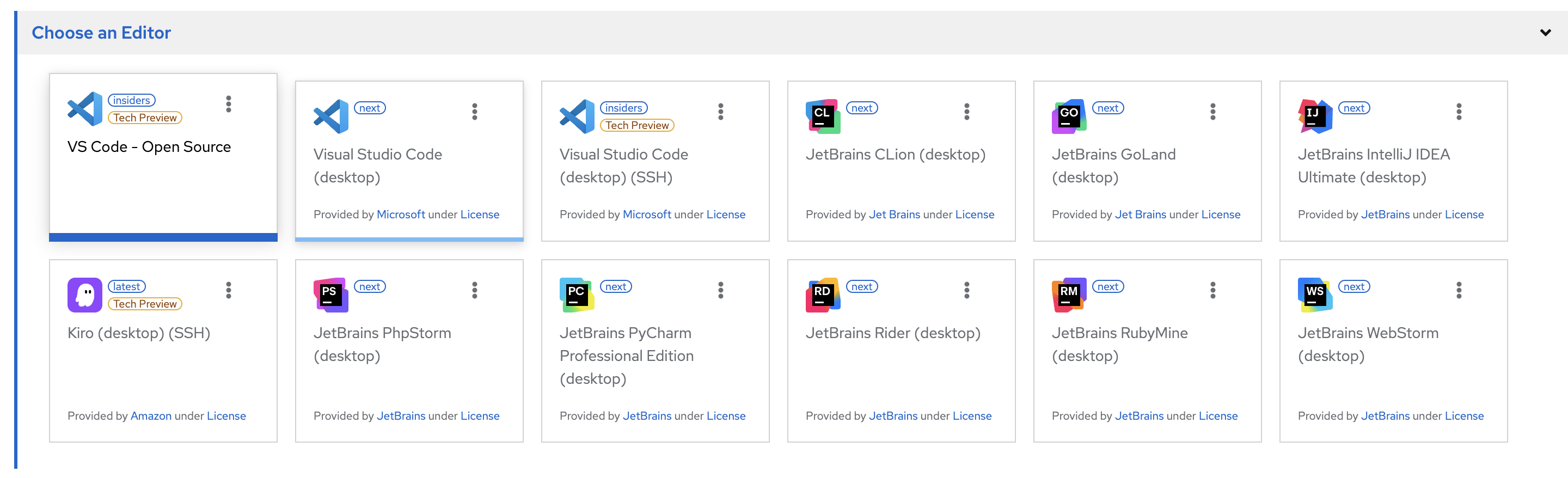 We need to change the order so that the default editor, VS Code - Open Source, appears first. Also, we shouldn't shuffle the VS Code and JetBrains editors — let's keep them grouped together: