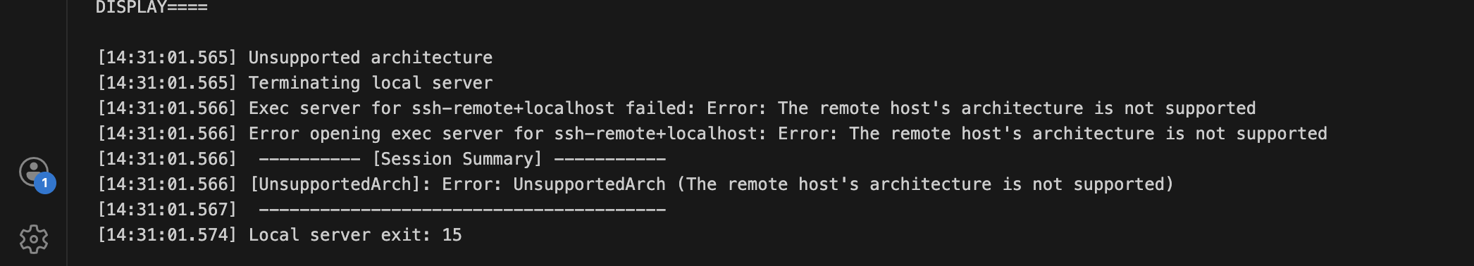 [13:05:44.186] Unsupported architecture [13:05:44.186] Terminating local server [13:05:44.187] Exec server for ssh-remote+localhost failed: Error: The remote host's architecture is not supported [13:05:44.187] Error opening exec server for ssh-remote+localhost: Error: The remote host's architecture is not supported [13:05:44.187] ---------- [Session Summary] ----------- [13:05:44.187] [UnsupportedArch]: Error: UnsupportedArch (The remote host's architecture is not supported) [13:05:44.187] ---------------------------------------- [13:05:44.190] Local server exit: 15
