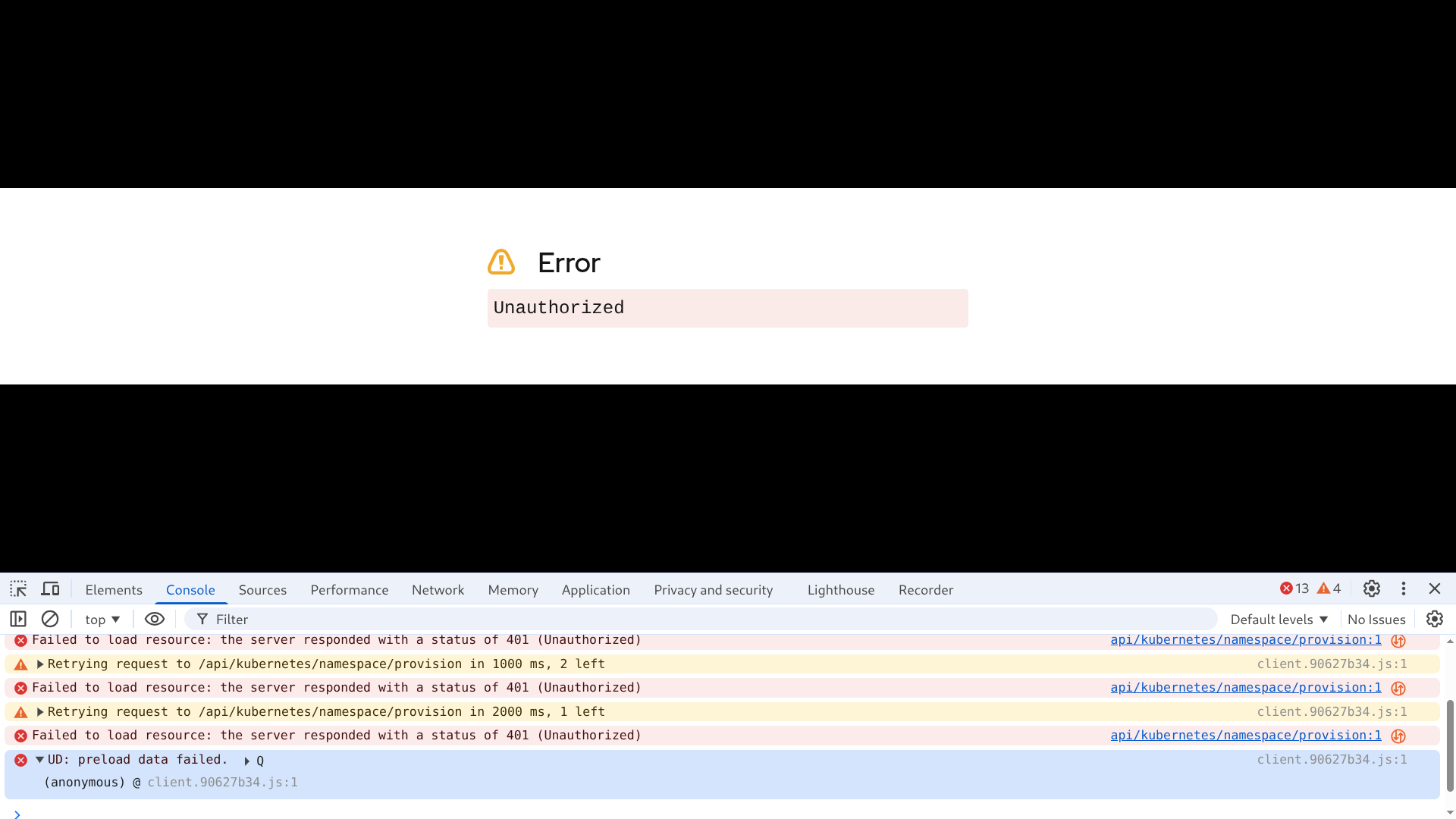 api/kubernetes/namespace/provision:1 Failed to load resource: the server responded with a status of 401 (Unauthorized)