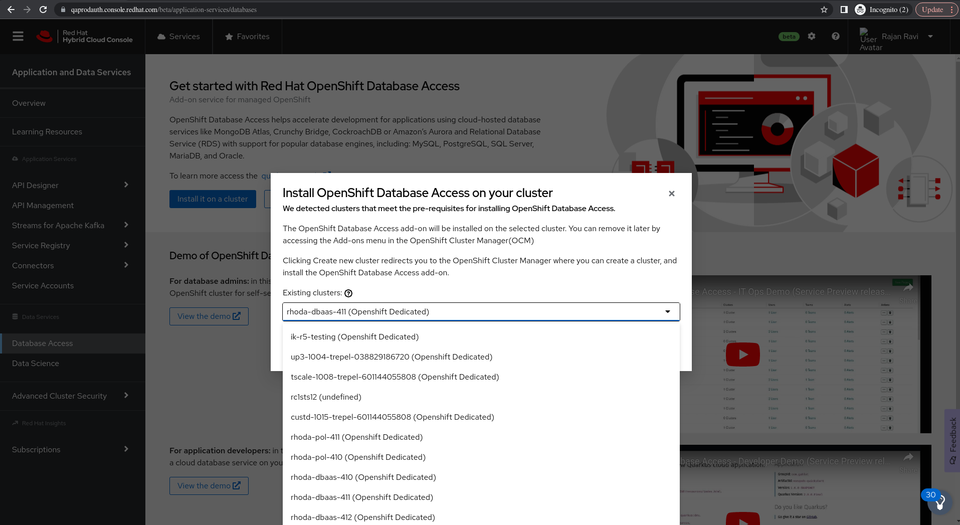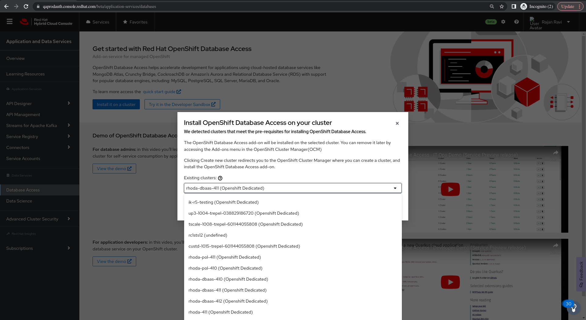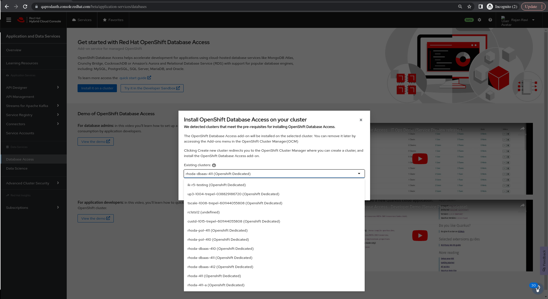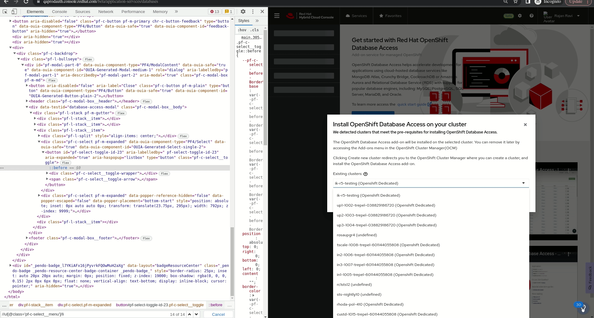On Install Openshift Database Access on your Cluster modal window, Existing Clusters drop down lists out only 13 clusters clusters within bounded resolution and the rest is hidden at the bottom of the page.