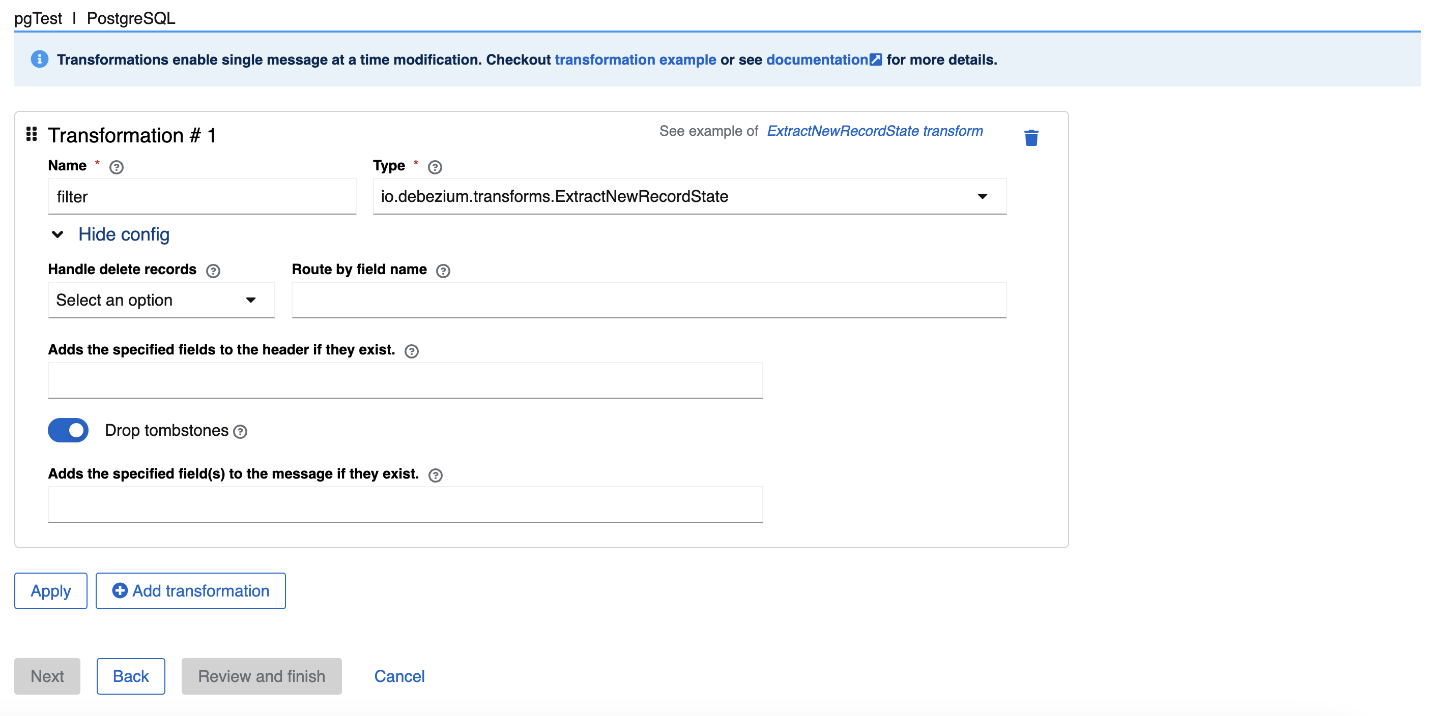 Ex. for "io.debezium.transforms.ExtractNewRecordState" SMT we are not getting fields for